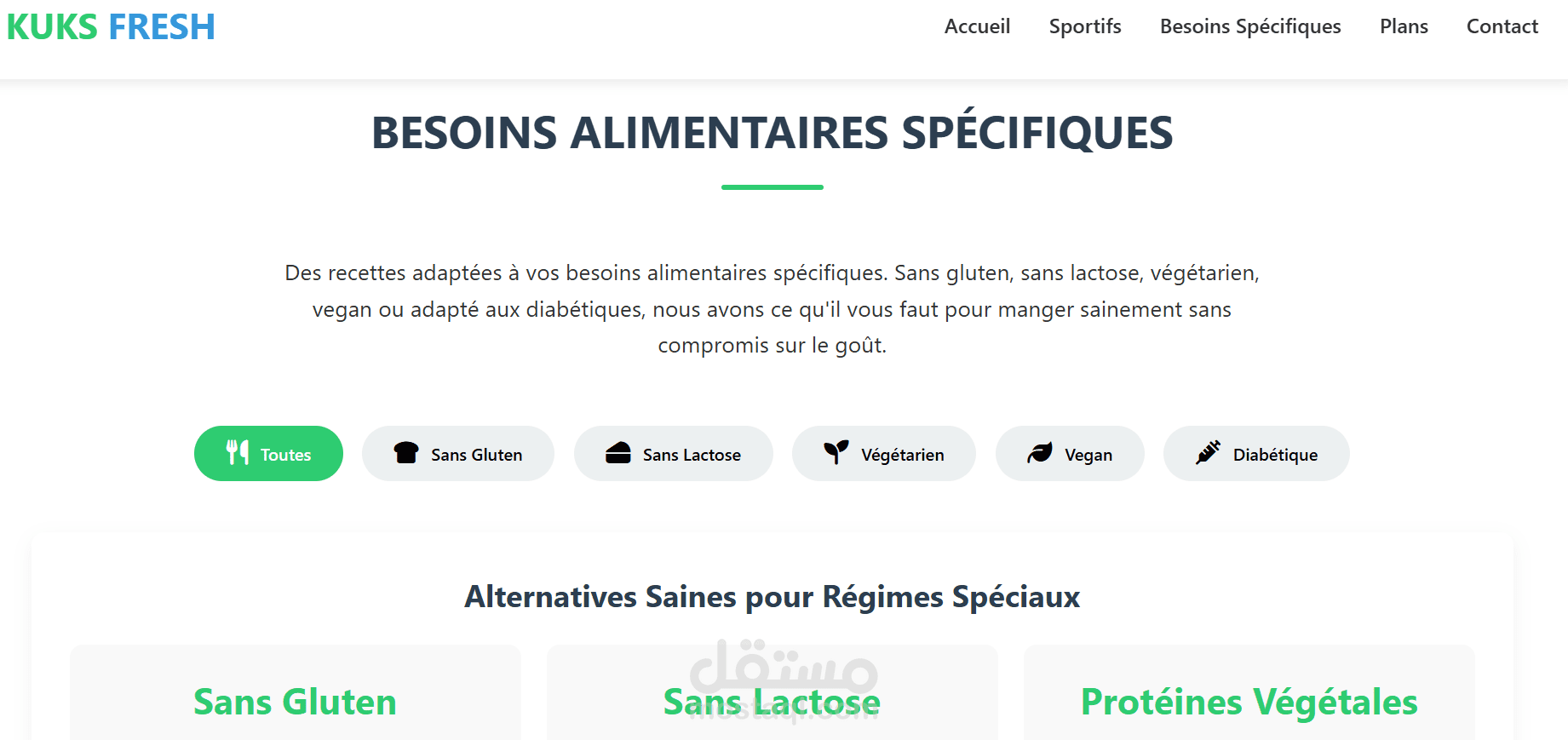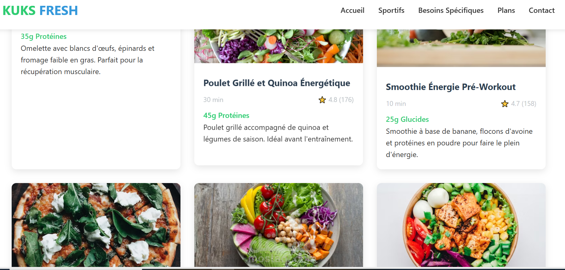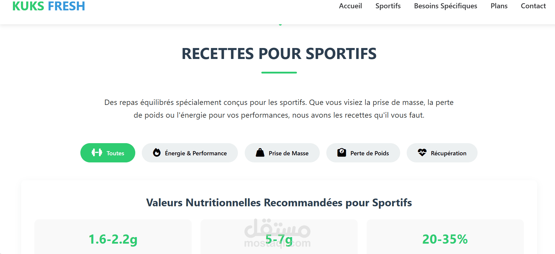 This website is dedicated to providing healthy and delicious recipes tailored to users’ goals and dietary needs. The header menu offers easy navigation with links to Home, Sportifs (for athletes), Special Needs, Plans, and Contact.