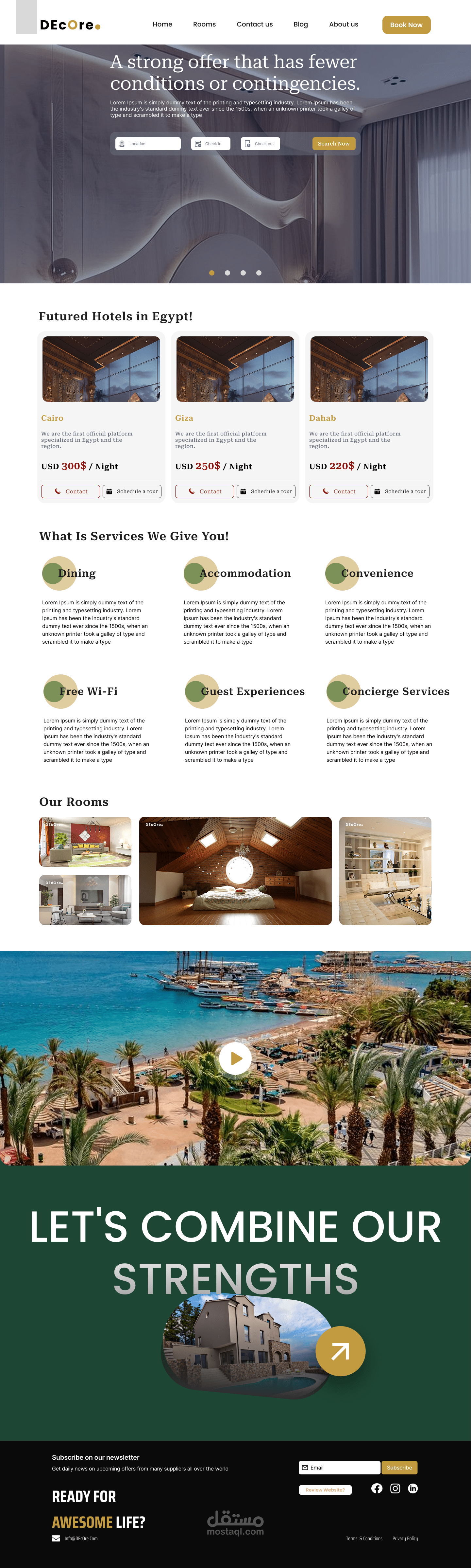 Explore the "DECore." Hotels website, showcasing featured hotels in Cairo, Giza, and Dahab with competitive nightly rates. The site highlights key services including exquisite dining, comfortable accommodation, modern conveniences like free Wi-Fi, personalized guest experiences, and dedicated concierge services. Visually appealing sections display diverse room styles and a captivating video background of a waterfront resort, all designed to offer a strong, reliable booking platform for your Egyptian adventures.