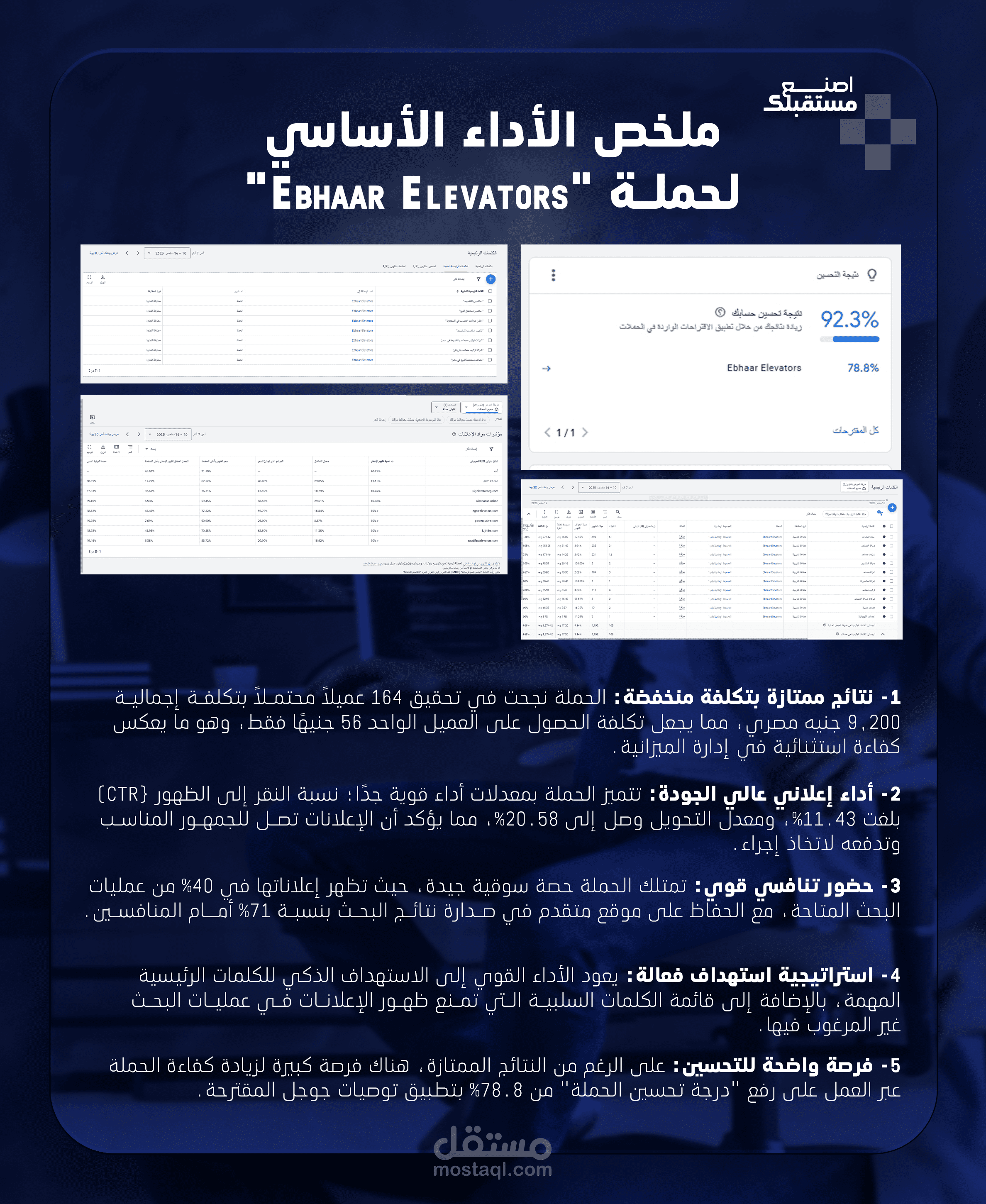 استراتيجية استهداف دقيقة: يعود نجاح الحملة إلى الاستهداف الدقيق للكلمات الرئيسية الصحيحة (مثل "صيانة وتركيب مصاعد") والاستخدام الفعال للكلمات السلبية التي منعت إهدار الميزانية على زيارات غير مهمة.