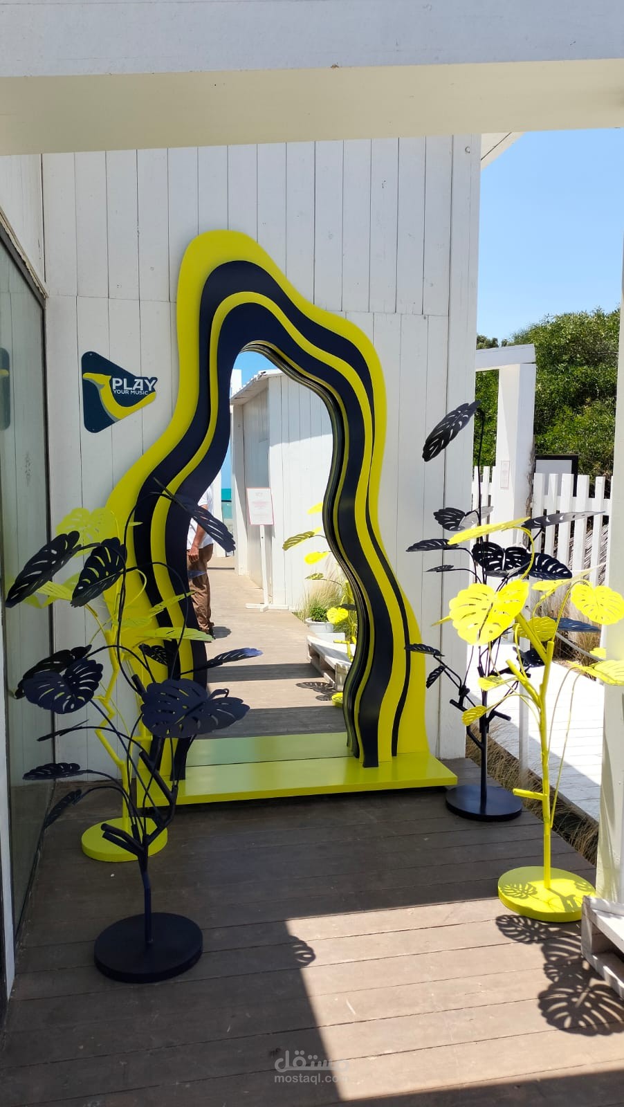 تم تزيين الفضاء بعناصر ديكورية على شكل أوراق نباتية باللونين الأصفر والأسود لإثراء جمالية الركن وإبراز الطابع الحيوي للعلامة.