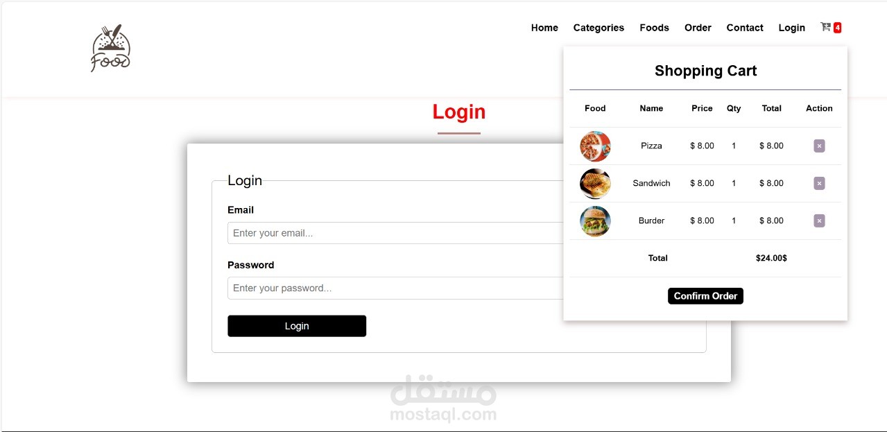 تُمكّن المستخدم من استعراض الأطعمة التي أضافها مع إمكانية الحذف أو تأكيد الطلب.
