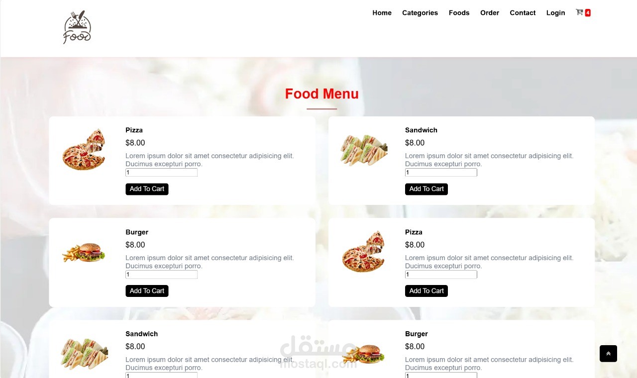 صفحة مميزة تعرض الأطعمة بالصور مع السعر والوصف، وزر لإضافة المنتج إلى عربة التسوق.