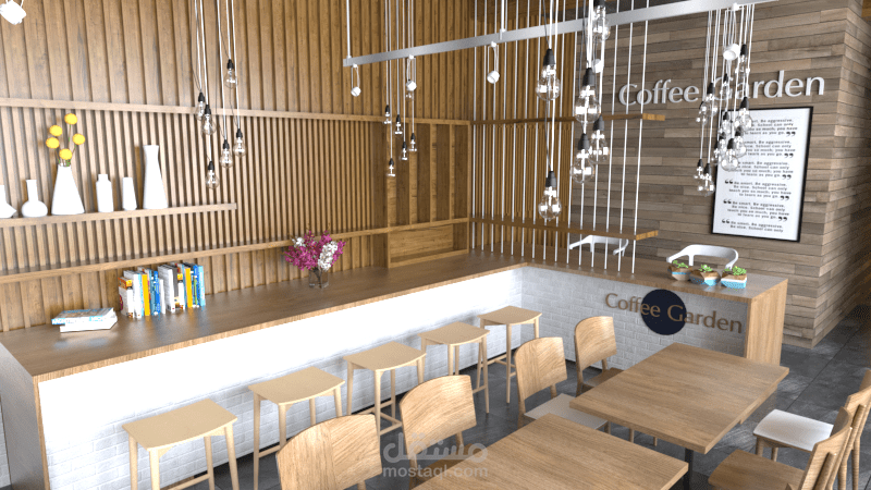 The coffee shop is envisioned as a warm and vibrant social hub, blending contemporary design with