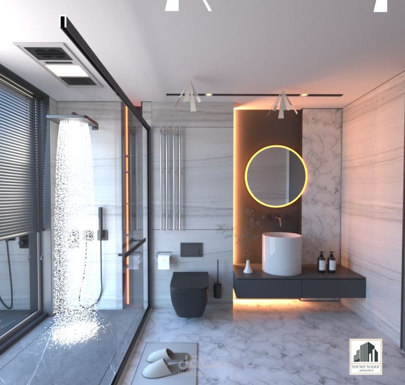 Ambient lighting, combined with focused task lighting around the mirror, ensures both