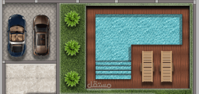 الحديقة وحوض السباحة: تصميم خارجي يجمع بين العشب الأخضر وأرضيات خشبية داكنة تحيط بالمسبح، مع جلسات استرخاء مستوحاة من المنتجعات الأفريقية.