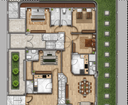المدخل الخارجي: يفتح على مساحة استقبال واسعة وحديقة جانبية مكسوة بالخضرة، تتناغم مع الأرضيات الحجرية لتعكس ارتباط الستايل الأفريقي بالطبيعة.