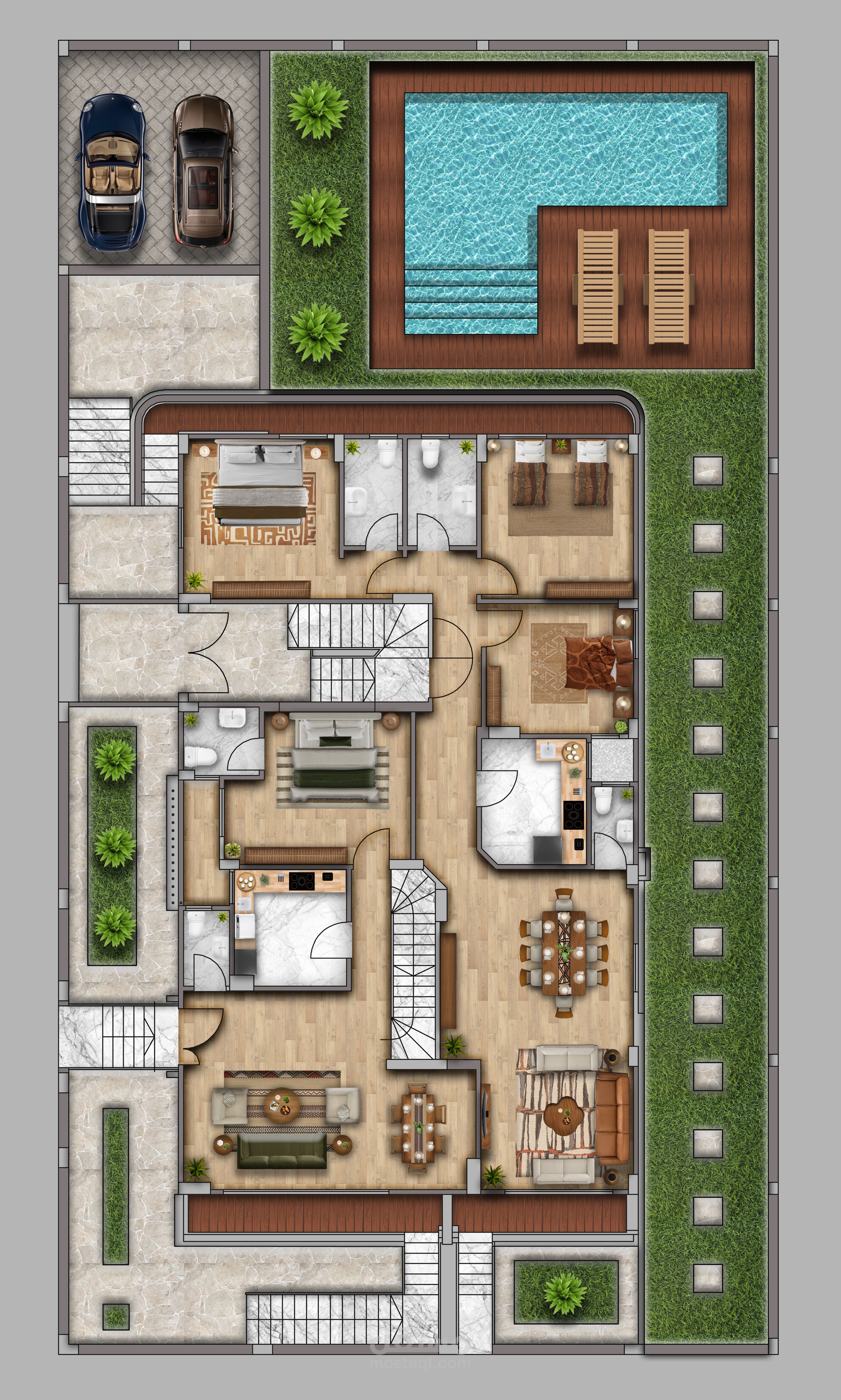 تمتاز هذه الفيلا الفاخرة بتصميم معماري حديث متأثر بعمق بالستايل الأفريقي، حيث يدمج بين الخطوط العصرية والمساحات الرحبة مع لمسات طبيعية دافئة. يمتد التخطيط على مساحة مستطيلة متناسقة، مع توزيع مدروس للفراغات يحقق الخصوصية والانسيابية في الحركة.