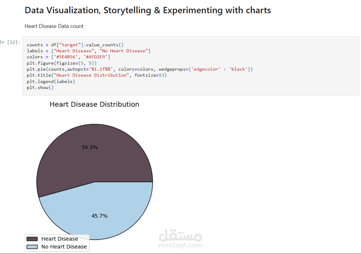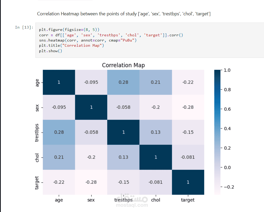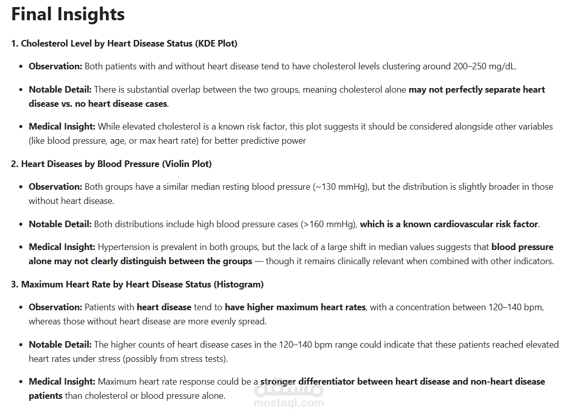 في هذا المشروع قمتُ بتحليل مجموعة بيانات طبية مرتبطة بأمراض القلب، بهدف استكشاف الأنماط والعلاقات بين العوامل الصحية المختلفة ومدى ارتباطها بوجود المرض.