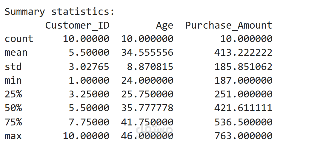 إجراء التحليل الوصفي واستخراج الإحصائيات الأساسية (المتوسط، الانحراف المعياري، القيم القصوى والدنيا).