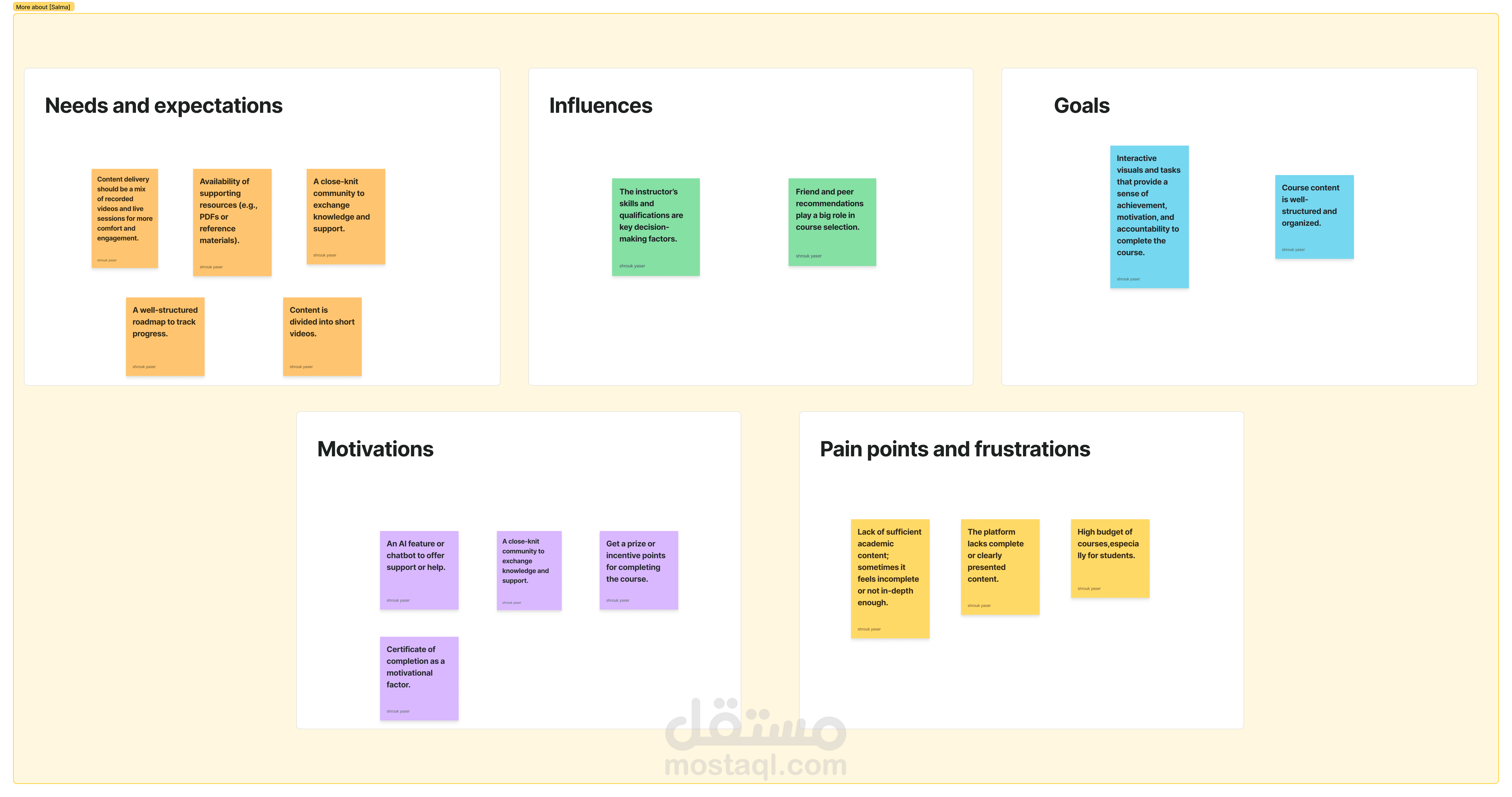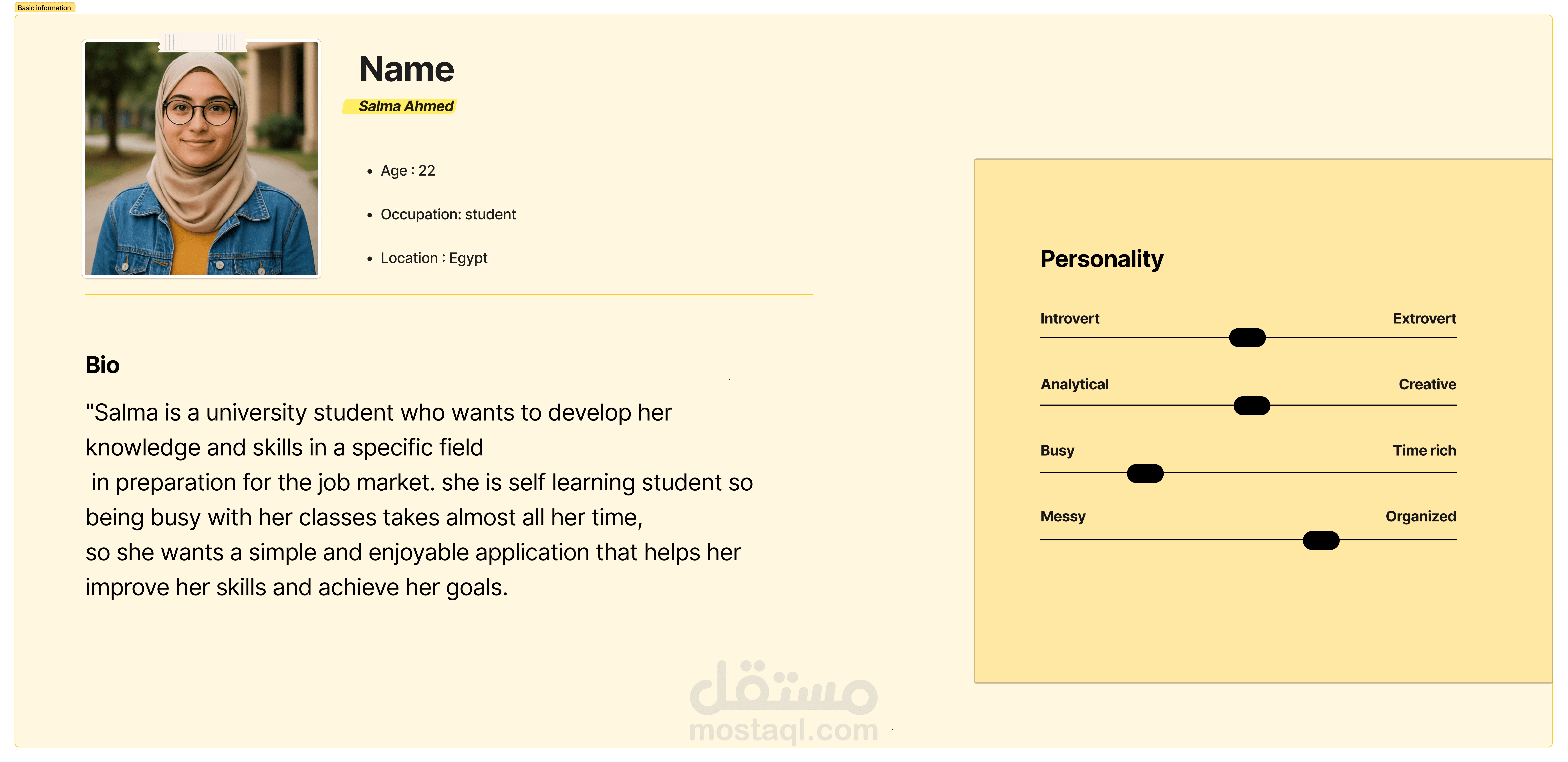 قمت بعمل User Persona لمشروع [موقع تعلم الكتروني] بهدف فهم المستخدمين المستهدفين بشكل أعمق.