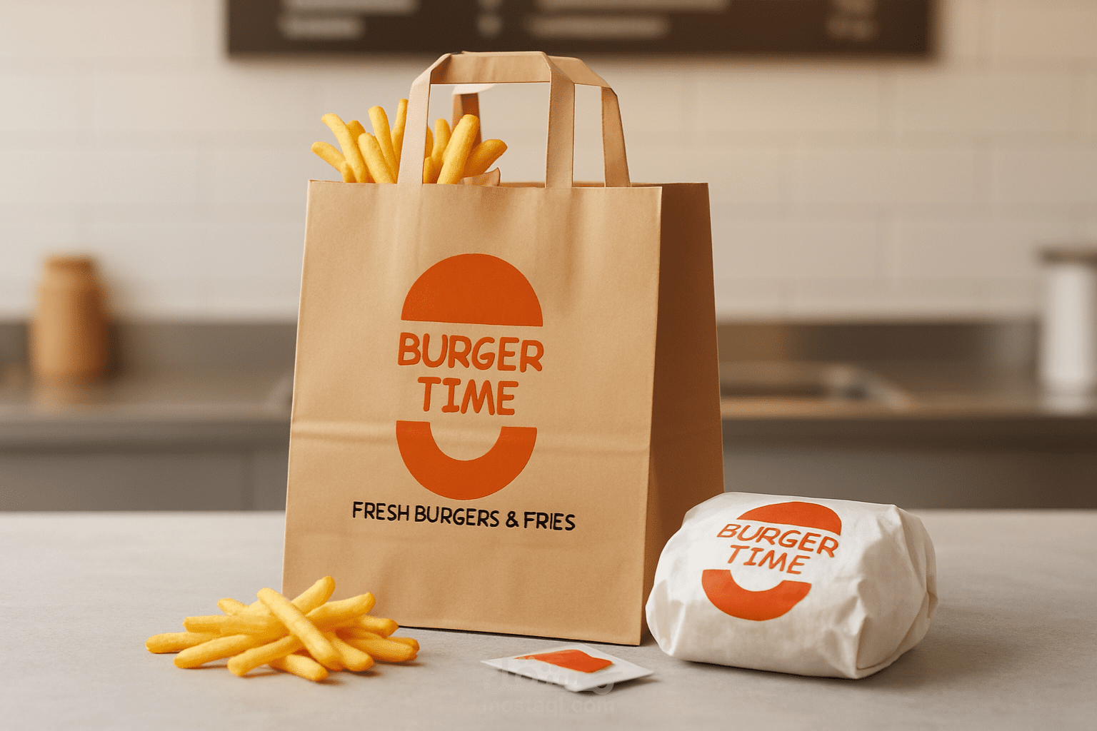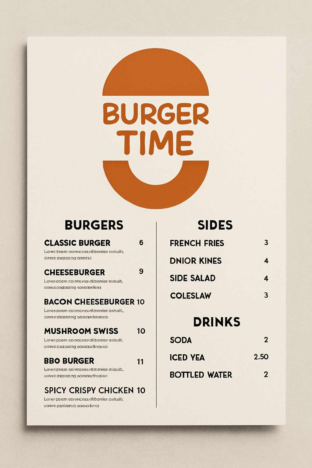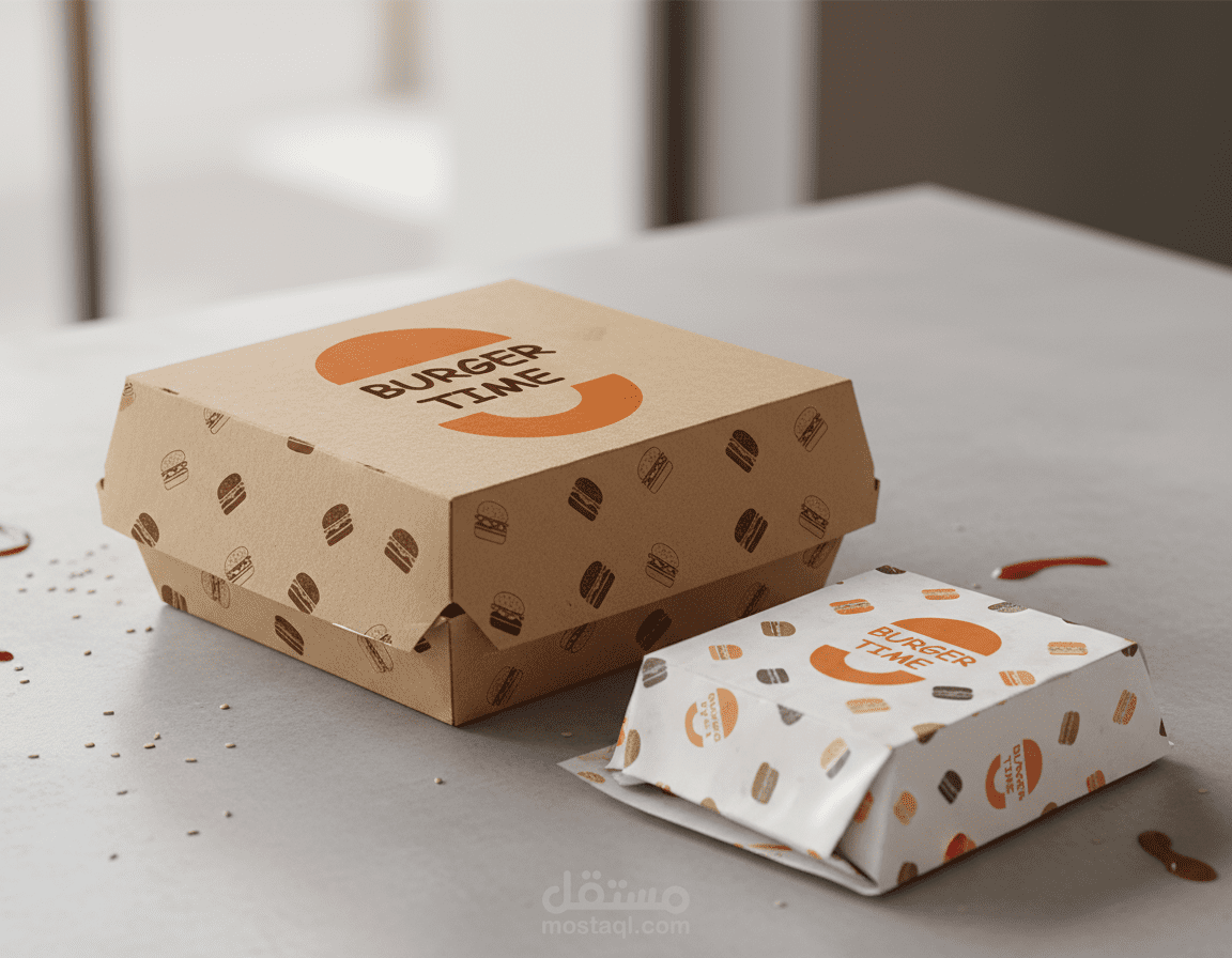 اللوجو يتكون من شكل دائري مقسوم إلى نصفين، يمثل شطيرة البرجر (الخبز العلوي والسفلي). في المنتصف مكتوب اسم العلامة التجارية "BURGER TIME" بخط بسيط ومرح يوحي بالود والعفوية. الشكل العام يوصل فكرة البرجر بشكل مباشر وبسيط، مما يجعل التصميم سهل التذكر وسهل الربط بنشاط المطعم.