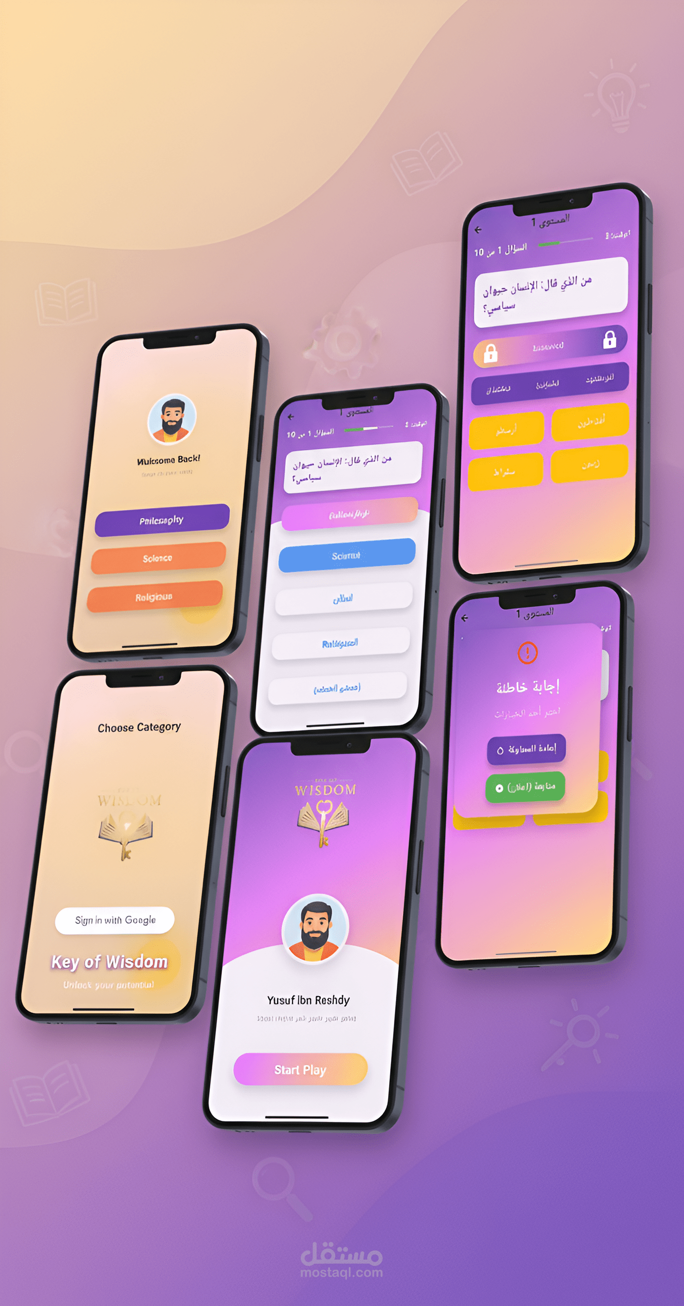 تطبيق "Key of Wisdom" هو تطبيق مسابقات تفاعلي مبني بتقنية Flutter ، يتيح للمستخدمين اختبار معلوماتهم في مجالات متنوعة من خلال مستويات متدرجة وصعوبة متزايدة. يتميز التطبيق بتصميم عصري وجذاب، مؤثرات صوتية عند الإجابة الصحيحة أو الخاطئة، وموسيقى خلفية مميزة. يدعم التطبيق تسجيل الدخول عبر Google، ويحتفظ بتقدم كل مستخدم بشكل منفصل. كما يوفر نظام فتح المستويات بشكل متسلسل، مع مؤقت زمني لكل سؤال، ورسائل تفاعلية عند الفوز أو انتهاء الوقت. التطبيق متوافق مع أنظمة Android وiOS، ويعتمد على Firebase لإدارة المستخدمين والبيانات.