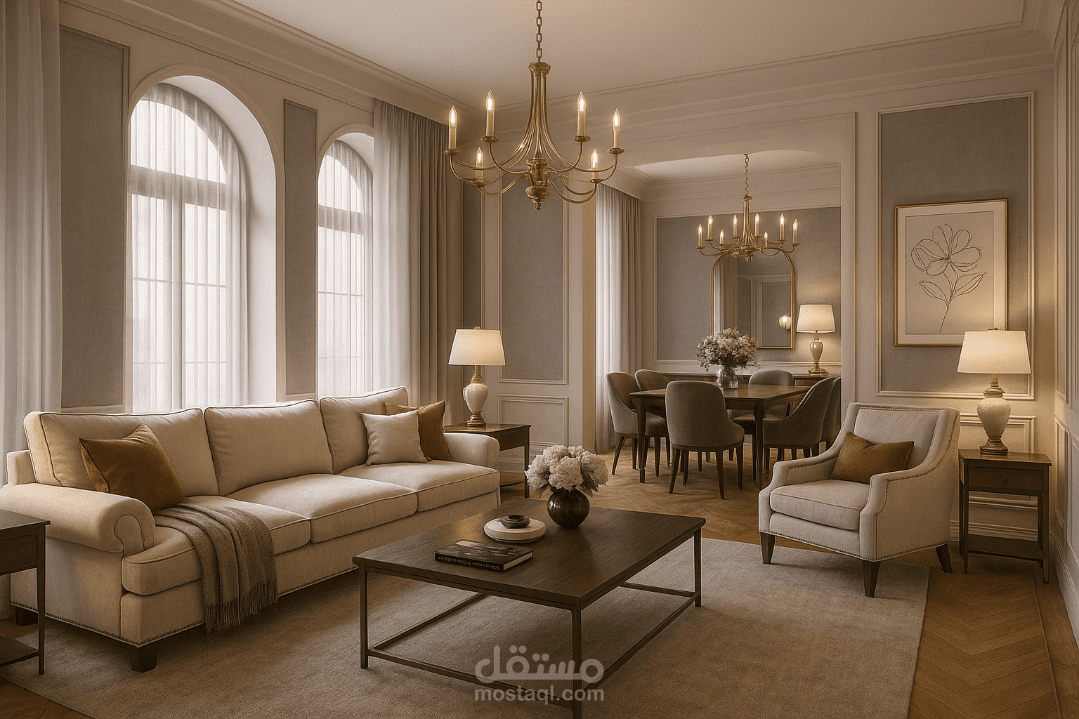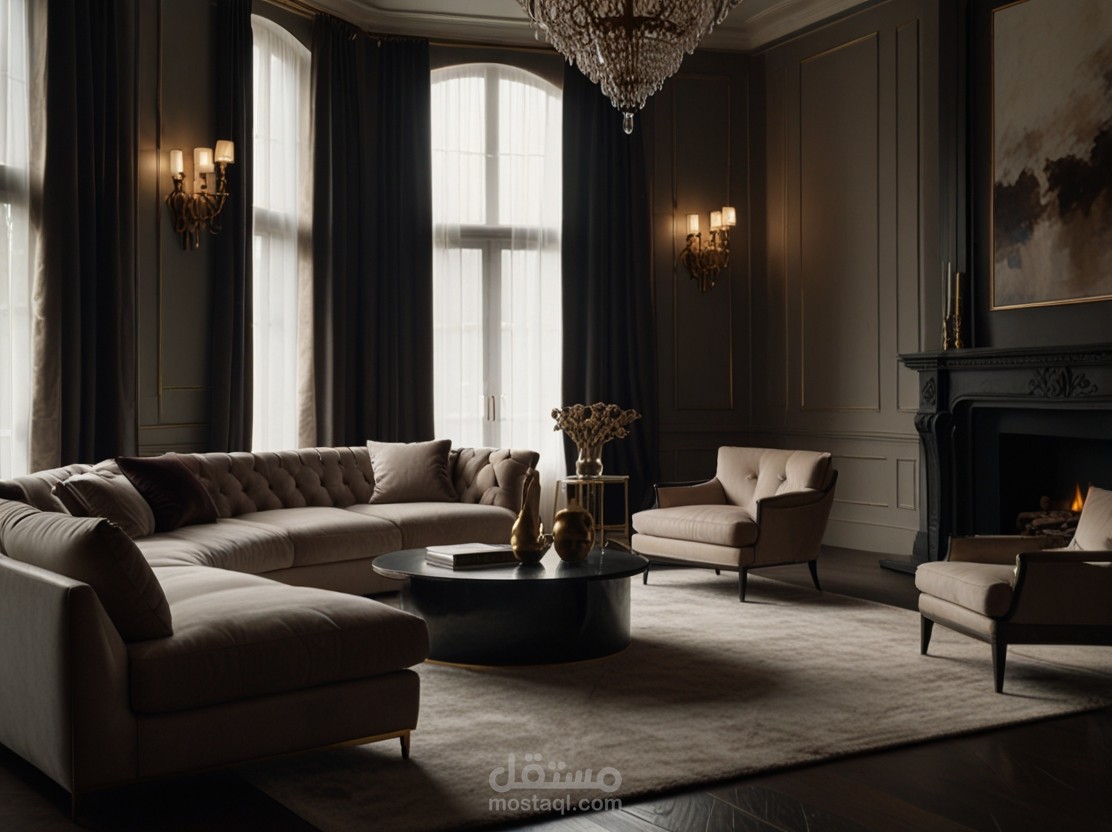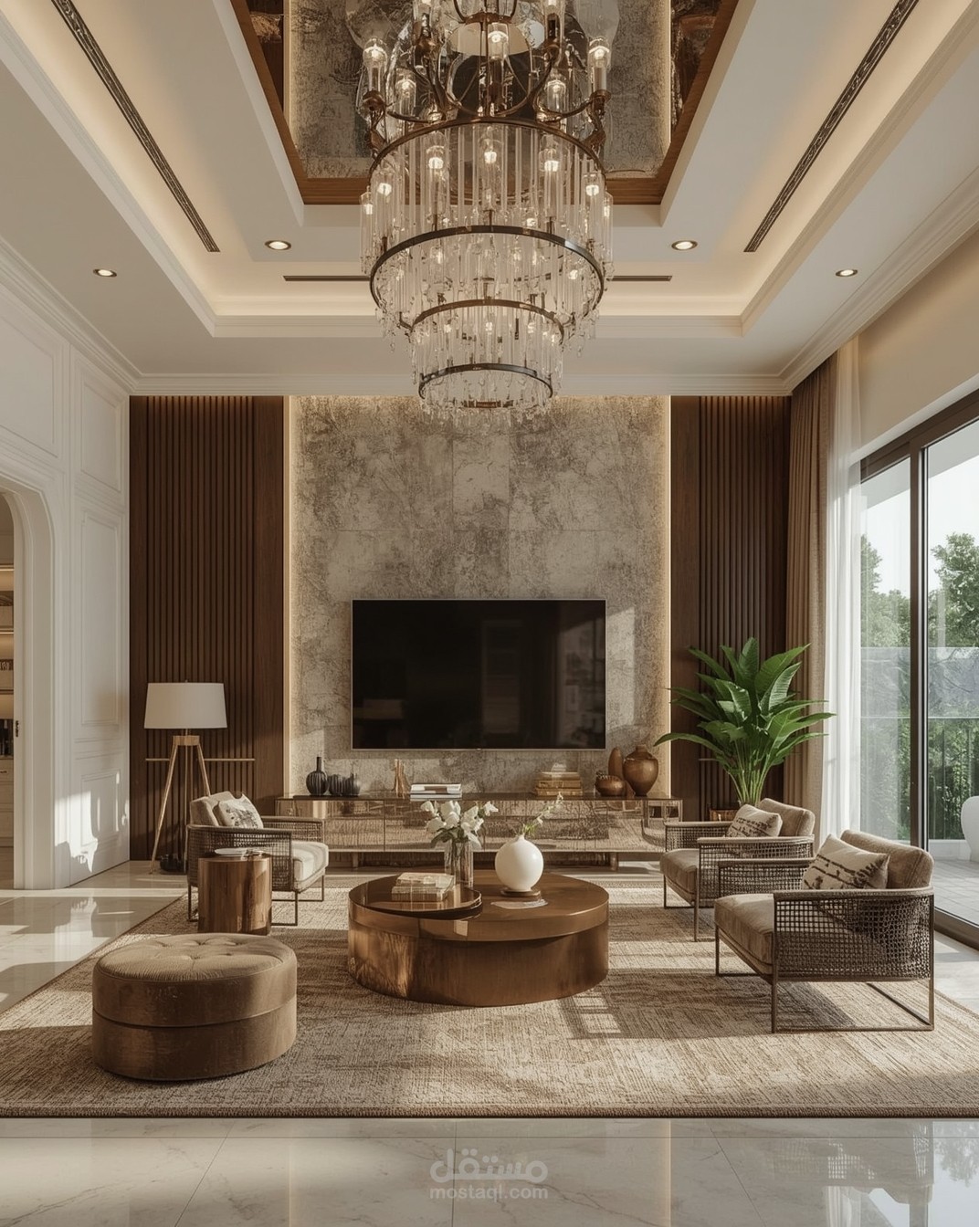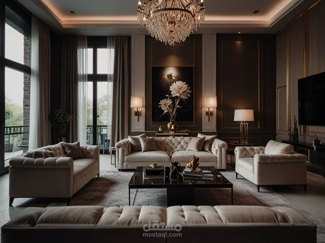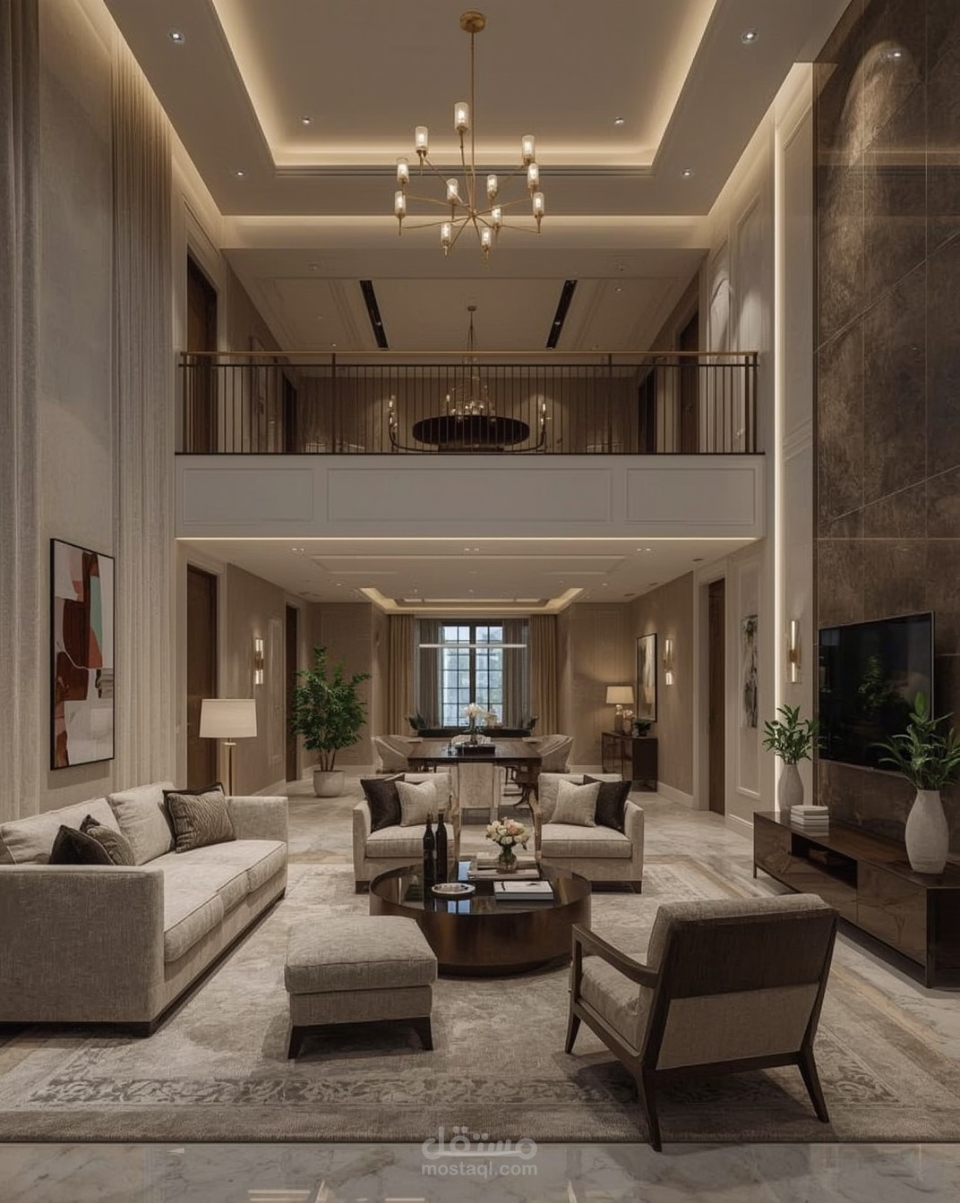 تتناغم عناصر الإضاءة، الأثاث، واللمسات الزخرفية لتعكس ذوقاً رفيعاً، مع الحفاظ على روح التصميم الكلاسيكي التي تمنح الفيلا هويتها الخالدة، لتصبح مساحة تجمع بين الفخامة العملية والجمال البصري الساحر.