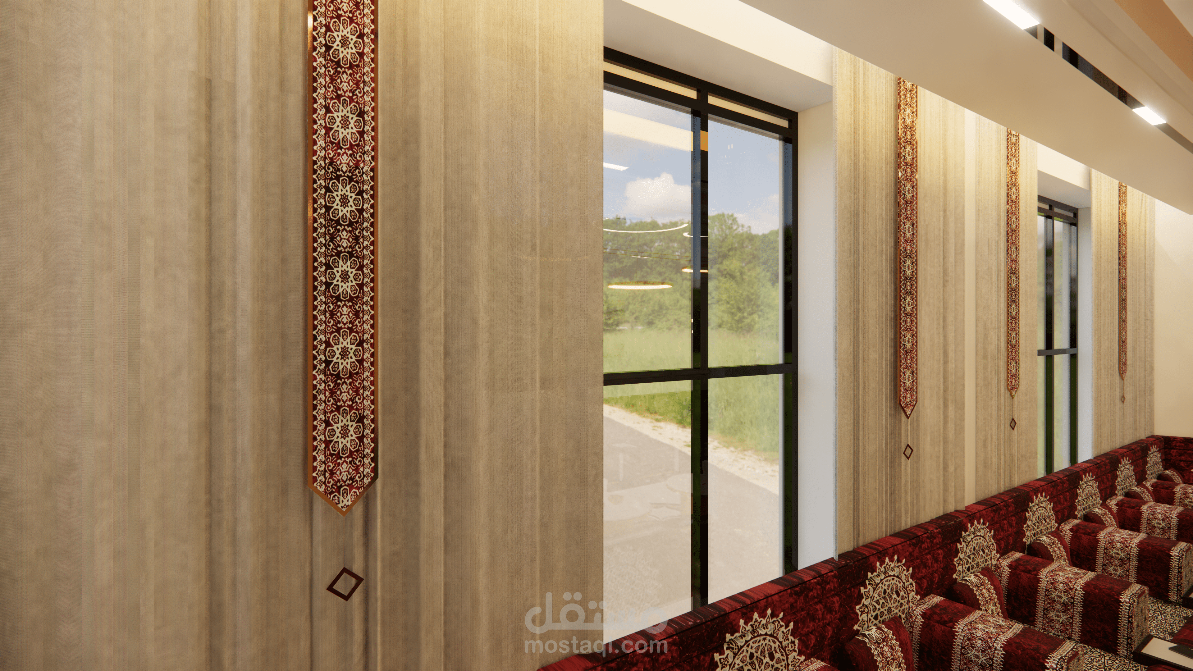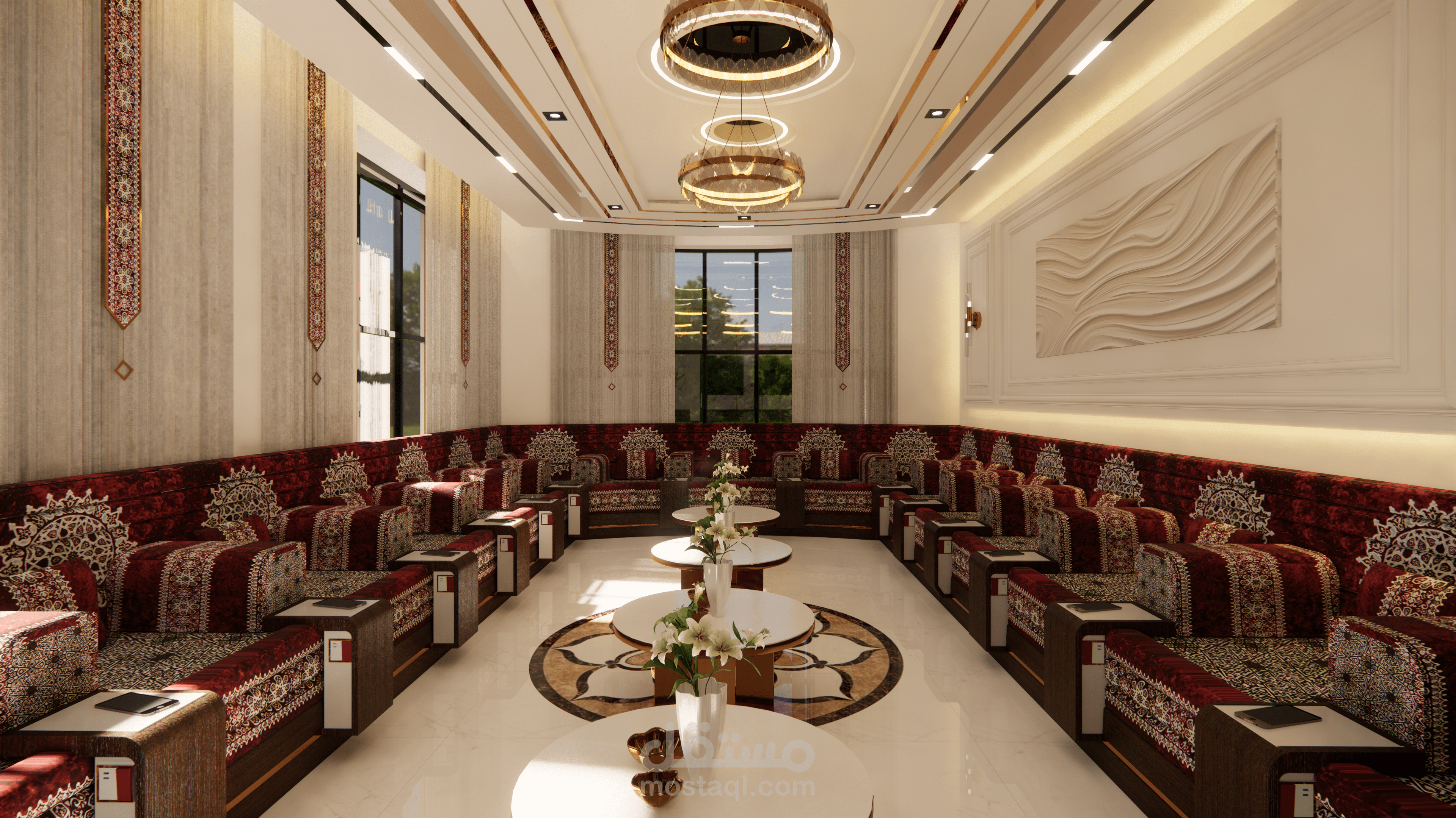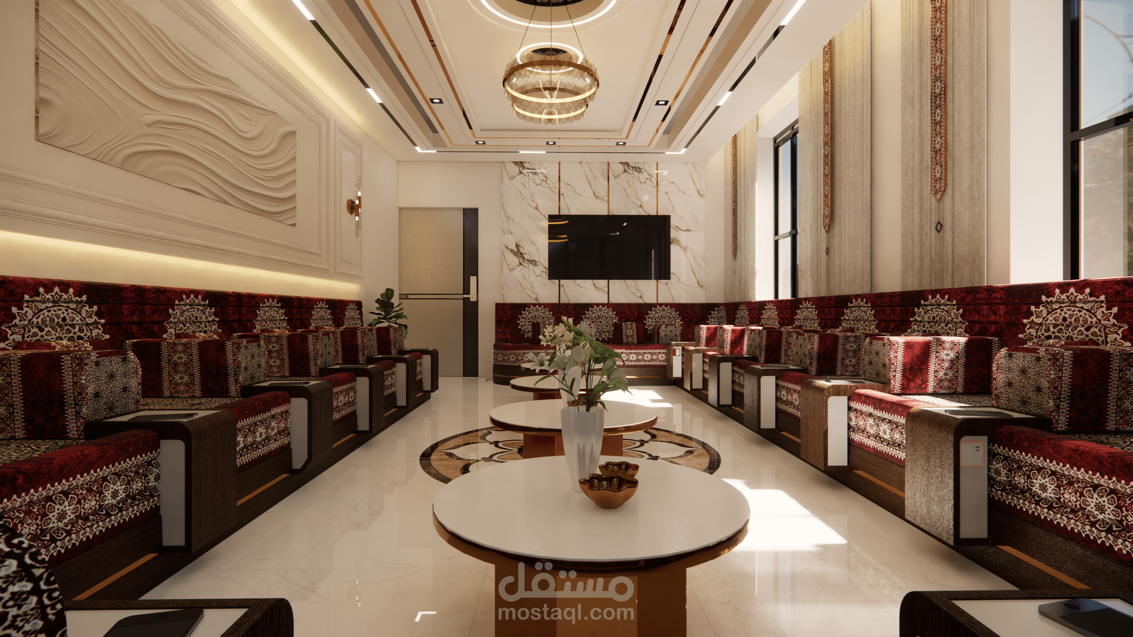 تم استخدام الألوان الدافئة والنقوش التقليدية لخلق جو ترحيبي مميز ، مع لمسات عصرية في الإضاءة والأسقف والكسوة الجدارية.