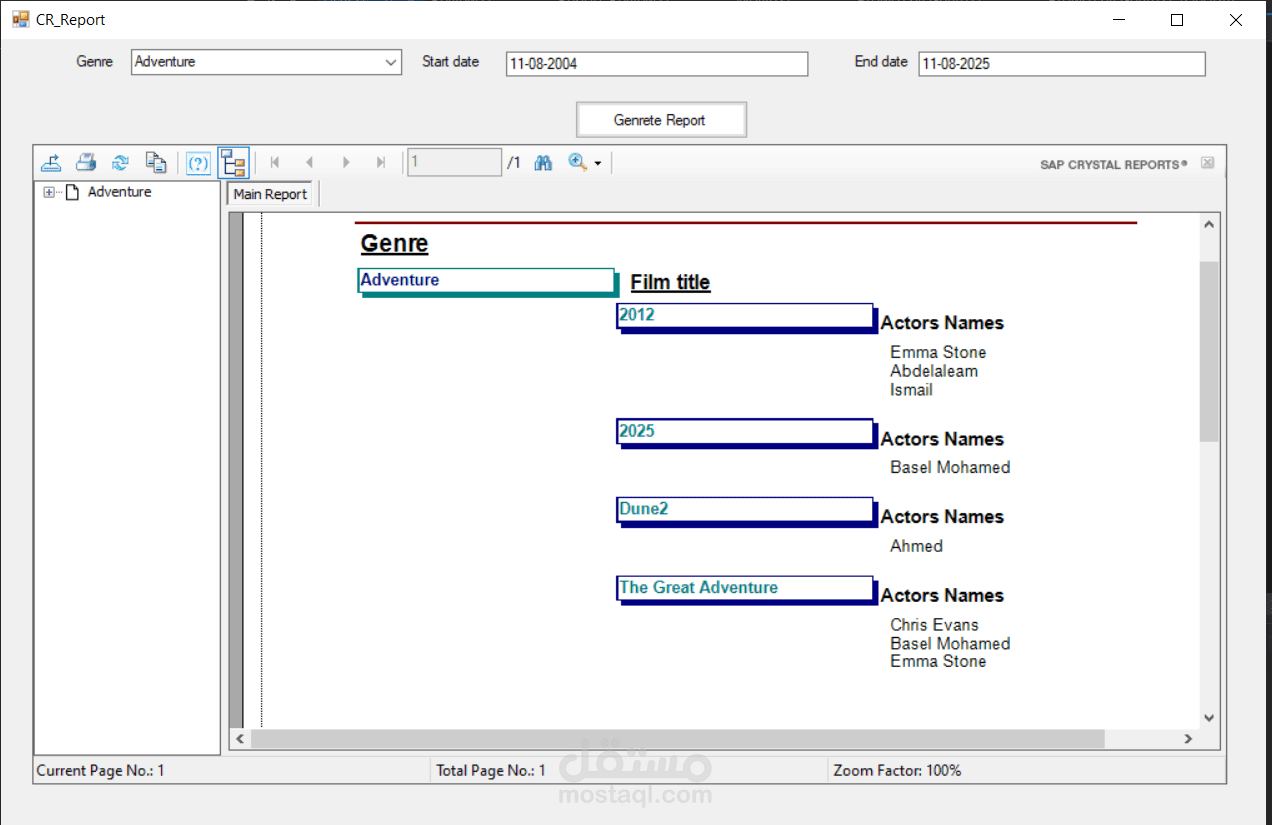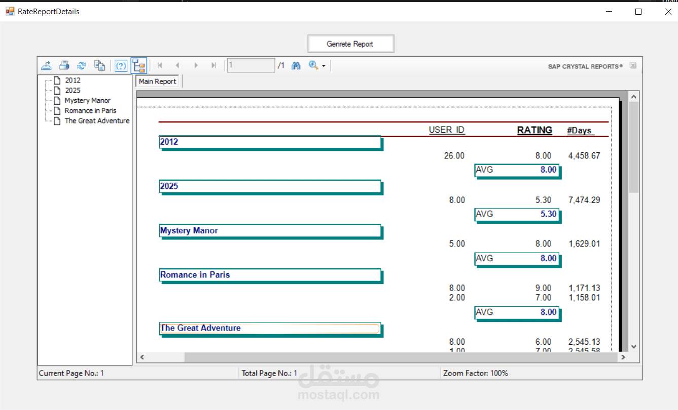 إنشاء تقارير تحليلية باستخدام Crystal Reports حول تقييمات ومراجعات الأفلام.