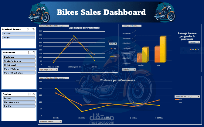 مشروع لوحة معلومات مبيعات الدراجات يهدف إلى تحليل وتتبع بيانات المبيعات الخاصة بالدراجات بشكل مرئي ومنظم. قمتُ بجمع البيانات وتنظيفها ومعالجتها، ثم تصميم لوحة تفاعلية تعرض أهم المؤشرات مثل: إجمالي المبيعات، أكثر الفروع تحقيقًا للأرباح، أنواع الدراجات الأكثر طلبًا، وفترات الذروة في المبيعات.