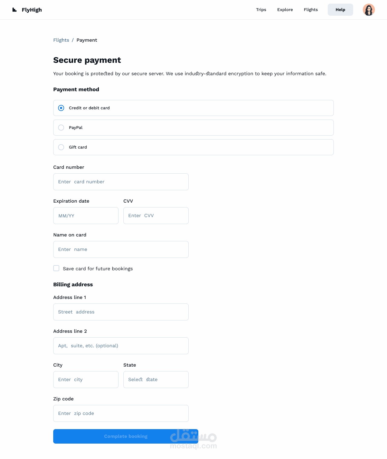 أماكن مخصصة لدمج بوابات الدفع وحسابات العملاء لاحقًا.