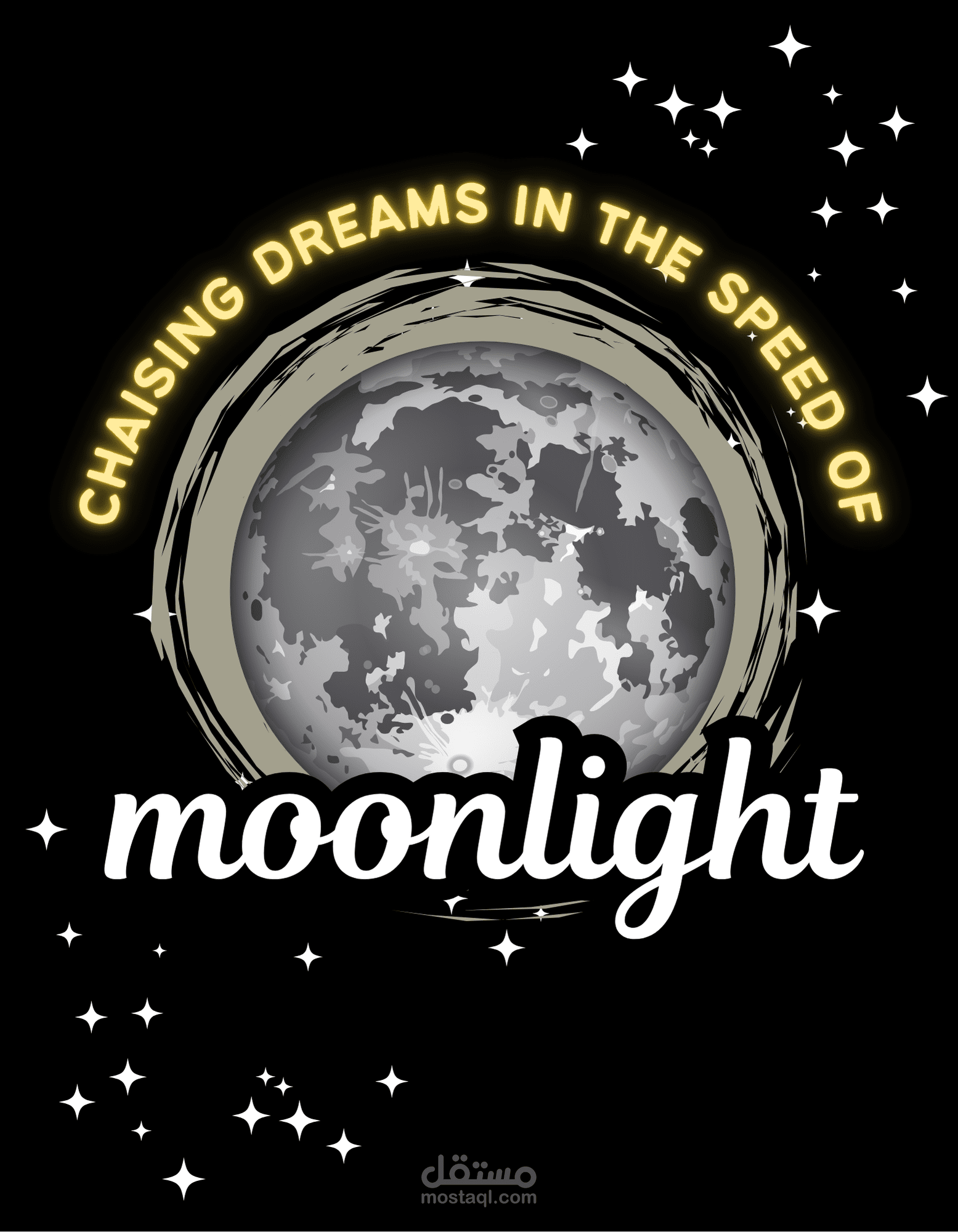 تصميم التيشيرت يتميز برسم قمر متألق على خلفية سوداء داكنة مع كتابة كلمة “Moonlight” بأسلوب أنيق أسفل القمر. الخلفية السوداء تبرز إشراقة القمر، مما يمنح التصميم طابعًا غامضًا وجذابًا. صُمم باستخدام Canva بلمسة تجمع بين البساطة والجمال الكوني، ليكون مناسبًا لعشاق الليل والحالمين وكل من يبحث عن أزياء عصرية ومميزة.