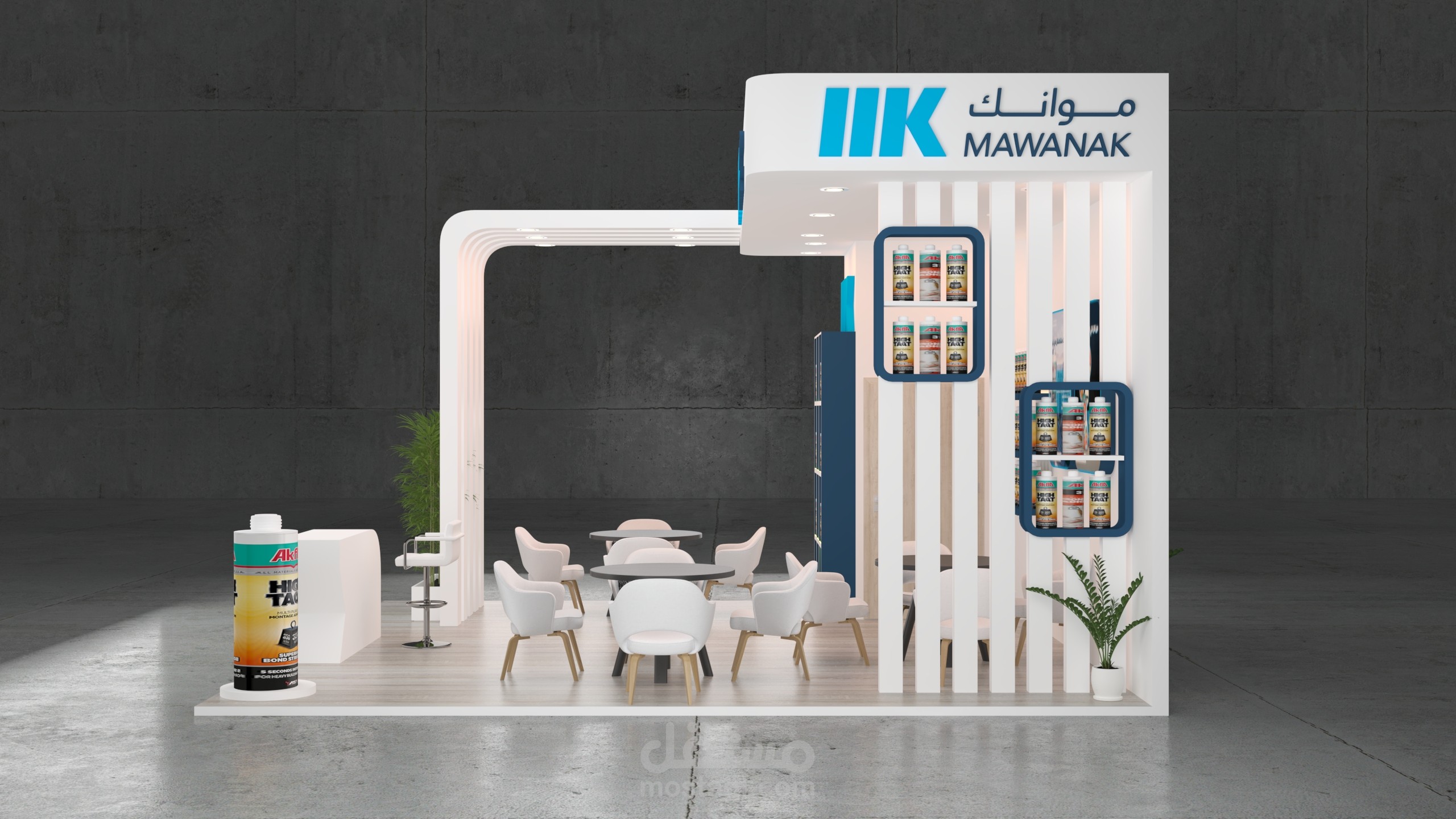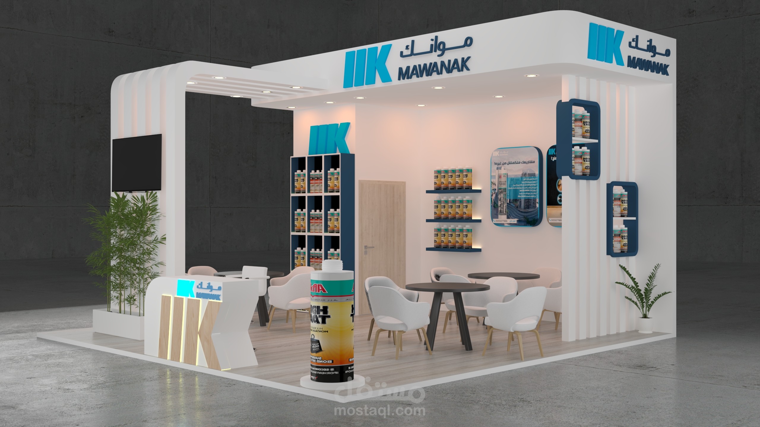 تم الاعتماد على ألوان وهوية الشركة (Mawanak) وإظهار المنتجات بشكل منظم على الرفوف الخلفية مع شاشات عرض لتقديم معلومات المنتج.