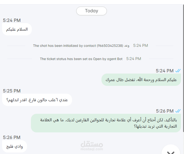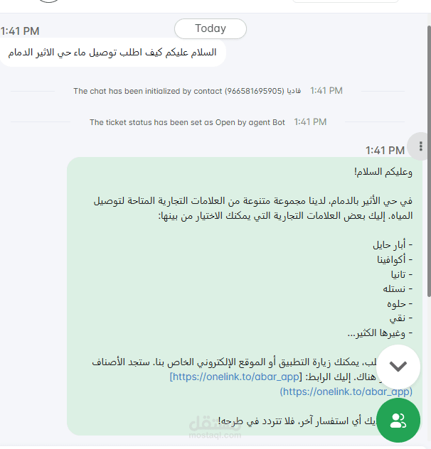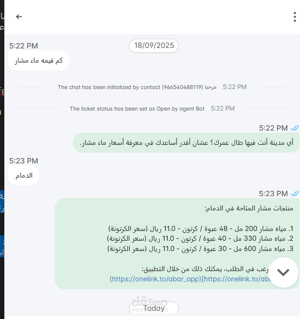 واتساب شات بوت لشركة مياه سعودية يقوم بالرد علي استفسارات العملاء المتعلقة بالمنتجات المتوفرة والعلامات التجارية المتوفرة في كل مدينة من مدن السعودية