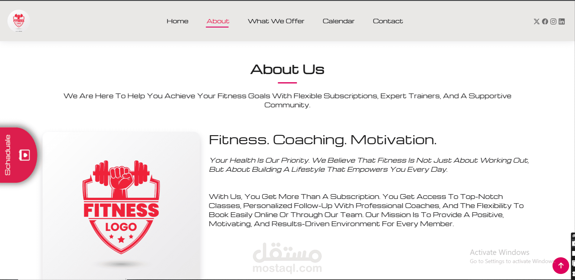 الموقع عبارة عن صفحة واحدة (Single Page Application) تم تصميمها لتكون واجهة تفاعلية تسهّل على الزوار التعرف على الصالة الرياضية، متابعة العروض، استعراض الجدول، وحجز الكلاسات مباشرة.