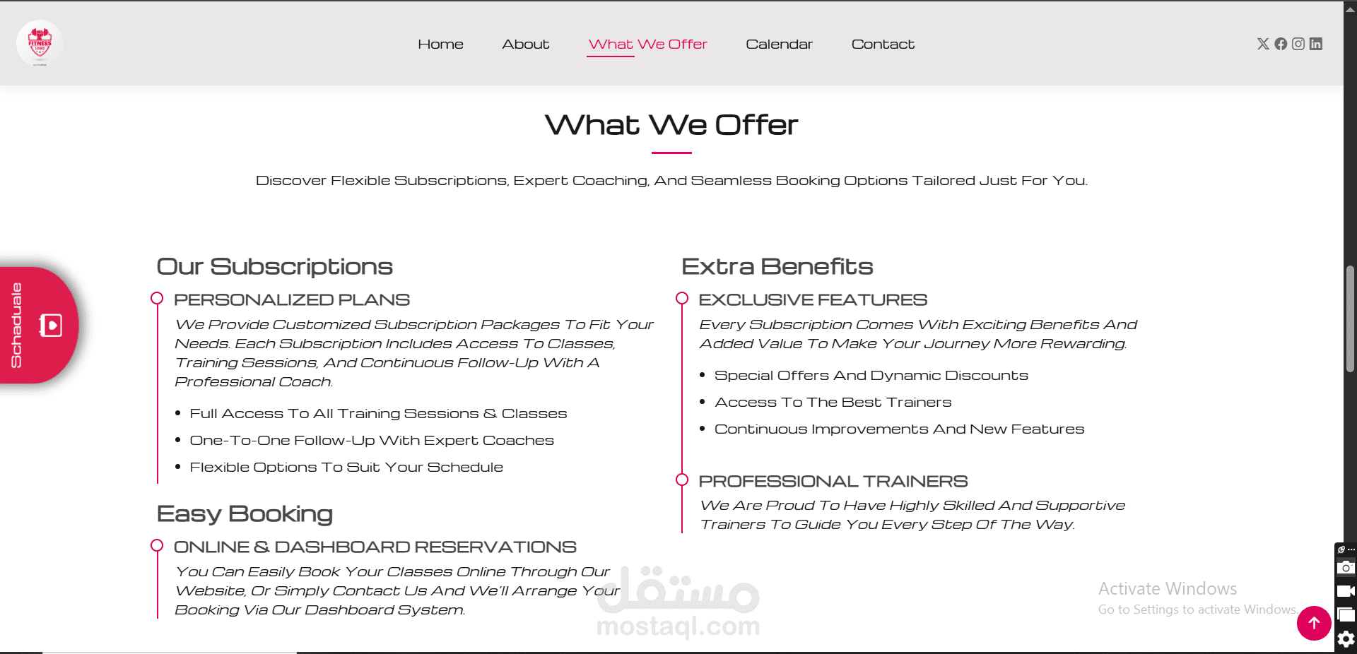 قسم "What We Offer" يوضح الخدمات والباقات المتاحة.