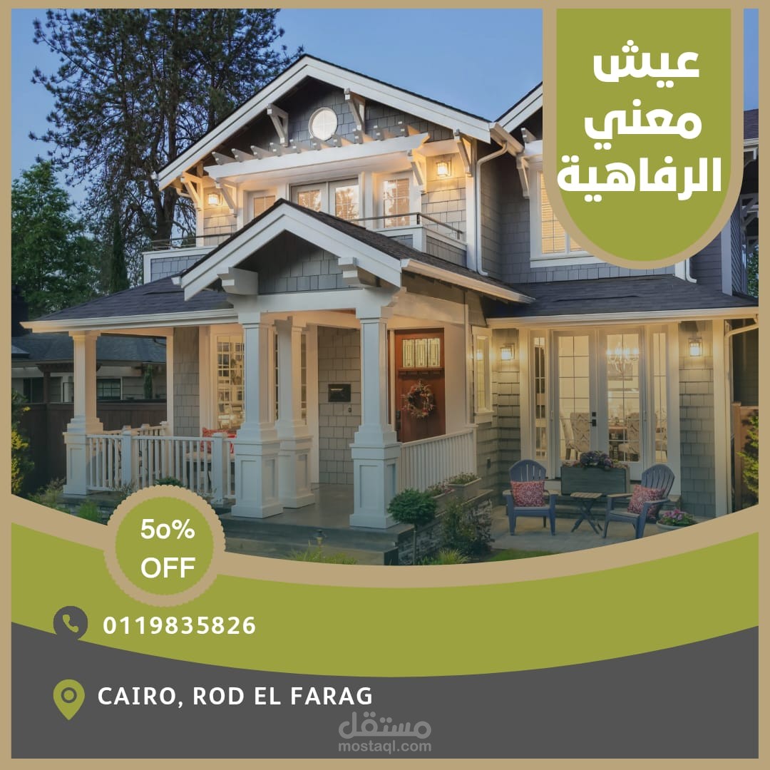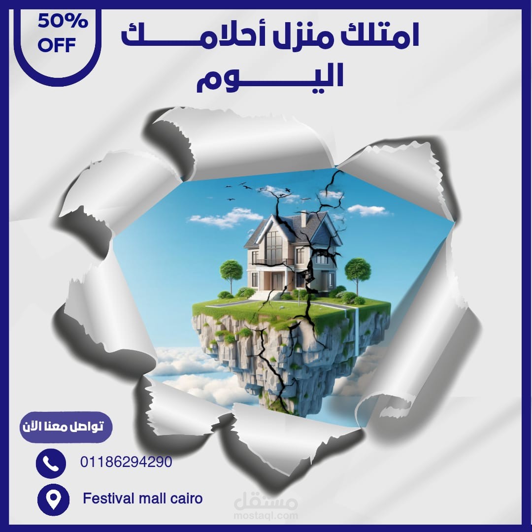 "بعمل تصميمات سوشيال ميديا خاصة بمجال العقارات بشكل احترافي وجذاب، بتركز على إبراز أهم مميزات العقار زي الموقع، السعر، المساحة، والتشطيب. بستخدم صور عالية الجودة مع ألوان متناسقة بتعكس الفخامة والثقة زي الأزرق والذهبي والرمادي.