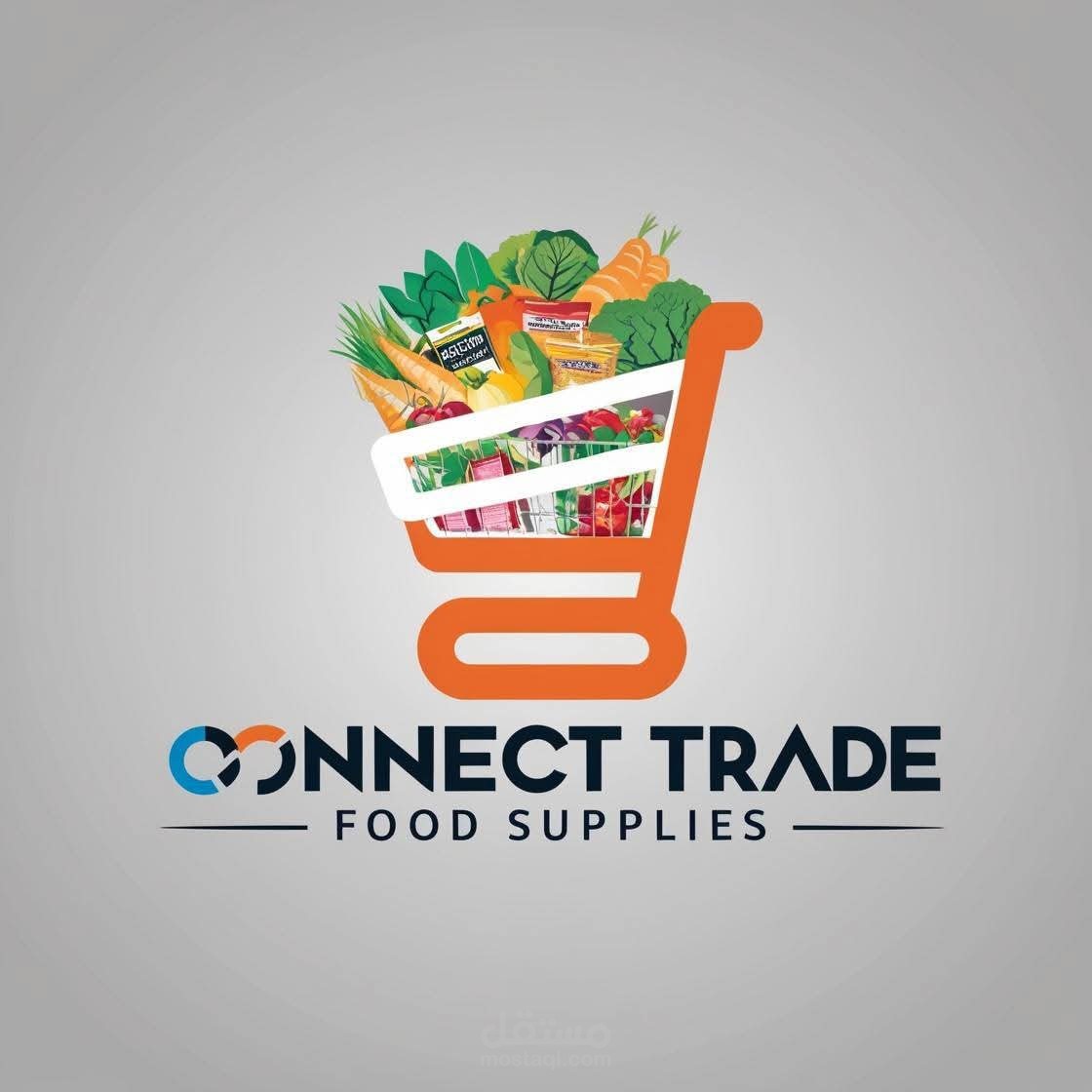 اللوجو عبارة عن عربة تسوق برتقالية مليئة بالخضار والمنتجات الغذائية، وأسفلها اسم CONNECT TRADE – FOOD SUPPLIES، ما يعكس نشاط الشركة في توريد الأغذية.