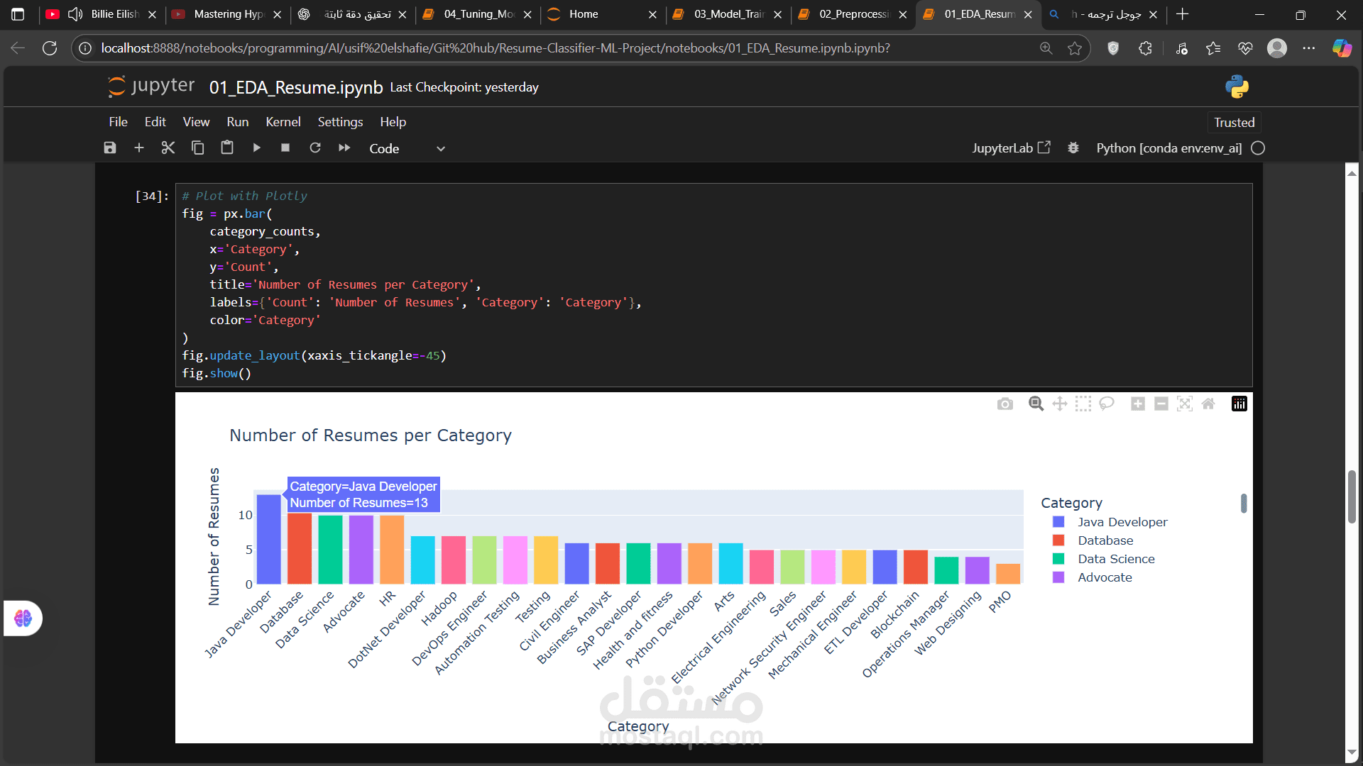 هذا المشروع يهدف إلى تصنيف السير الذاتية تلقائياً إلى فئات وظيفية مختلفة باستخدام تقنيات معالجة اللغة الطبيعية (NLP) وخوارزميات تعلم الآلة. قمت بتنظيف البيانات النصية من الروابط والرموز غير الضرورية، ثم استخدمت تقنية TF-IDF لتحويل النصوص إلى تمثيل عددي يمكن للنماذج فهمه. درّبت عدة نماذج مثل الانحدار اللوجستي، الغابات العشوائية، وKNN، مع تحسين الأداء باستخدام Optuna لضبط المعاملات. كما نفذت أسلوب Localized SVM لتحسين دقة التنبؤ في البيانات غير المتوازنة. المشروع يتضمن كود نظيف، نماذج مدربة، ورسوم بيانية توضح النتائج.