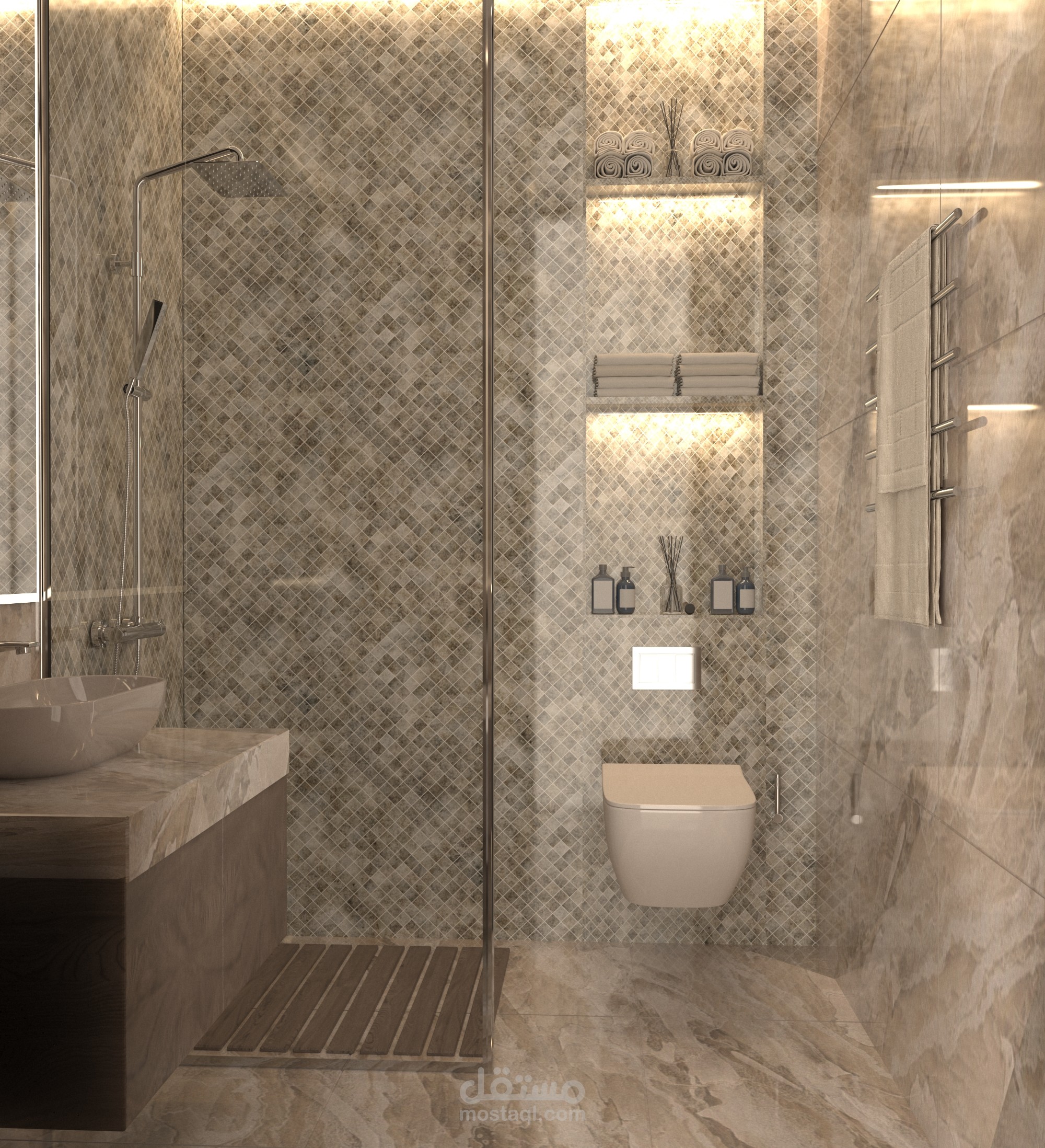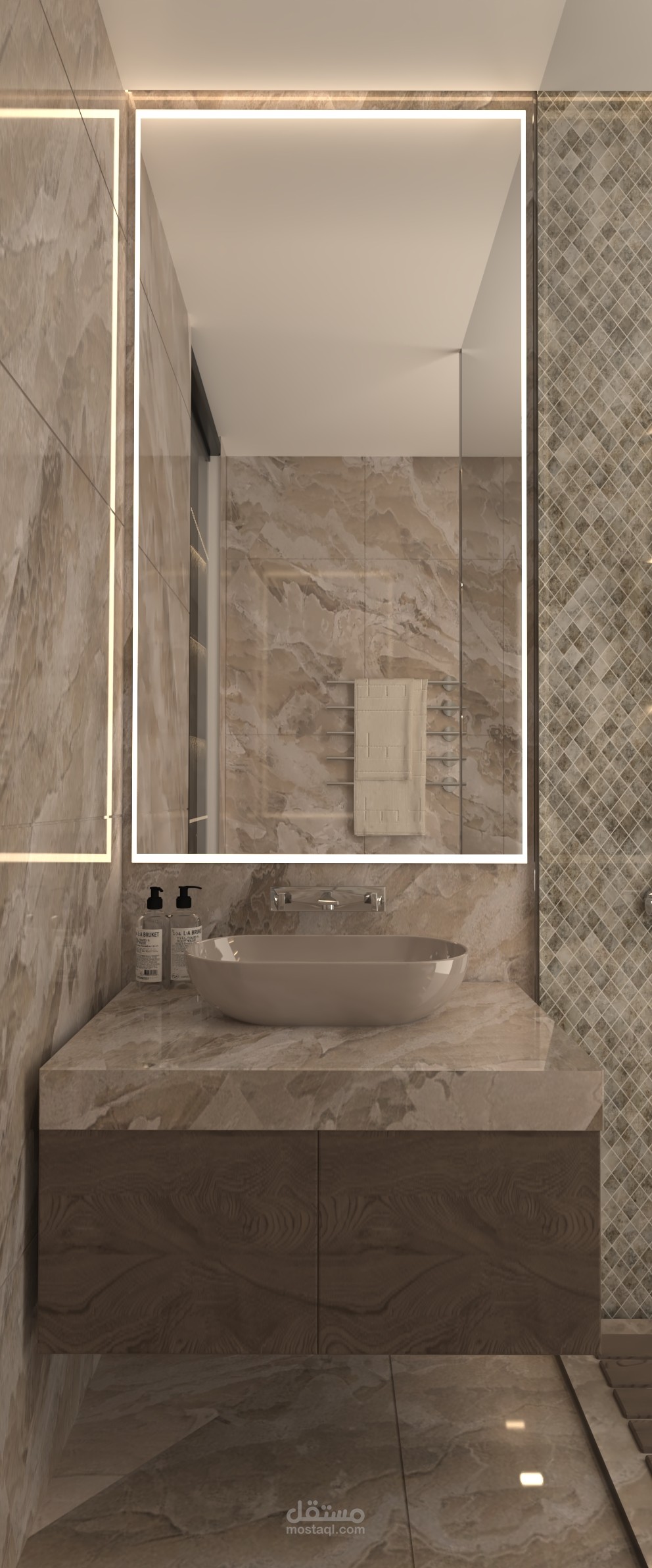 The design emphasizes a contemporary character through clean lines and neutral colors, enhancing a sense of calm and simplicity. Modern materials are applied with carefully considered contrasts, alongside varied lighting elements including concealed and directed lighting to create a visual balance between functionality and aesthetics. The result is an elegant, practical, and harmonious space that reflects the spirit of modern design.