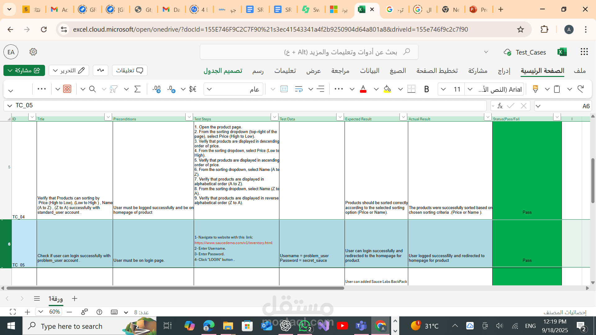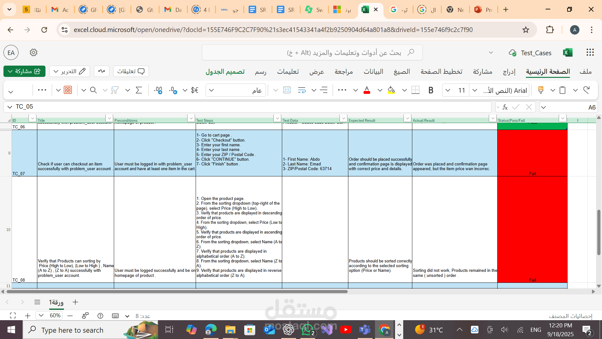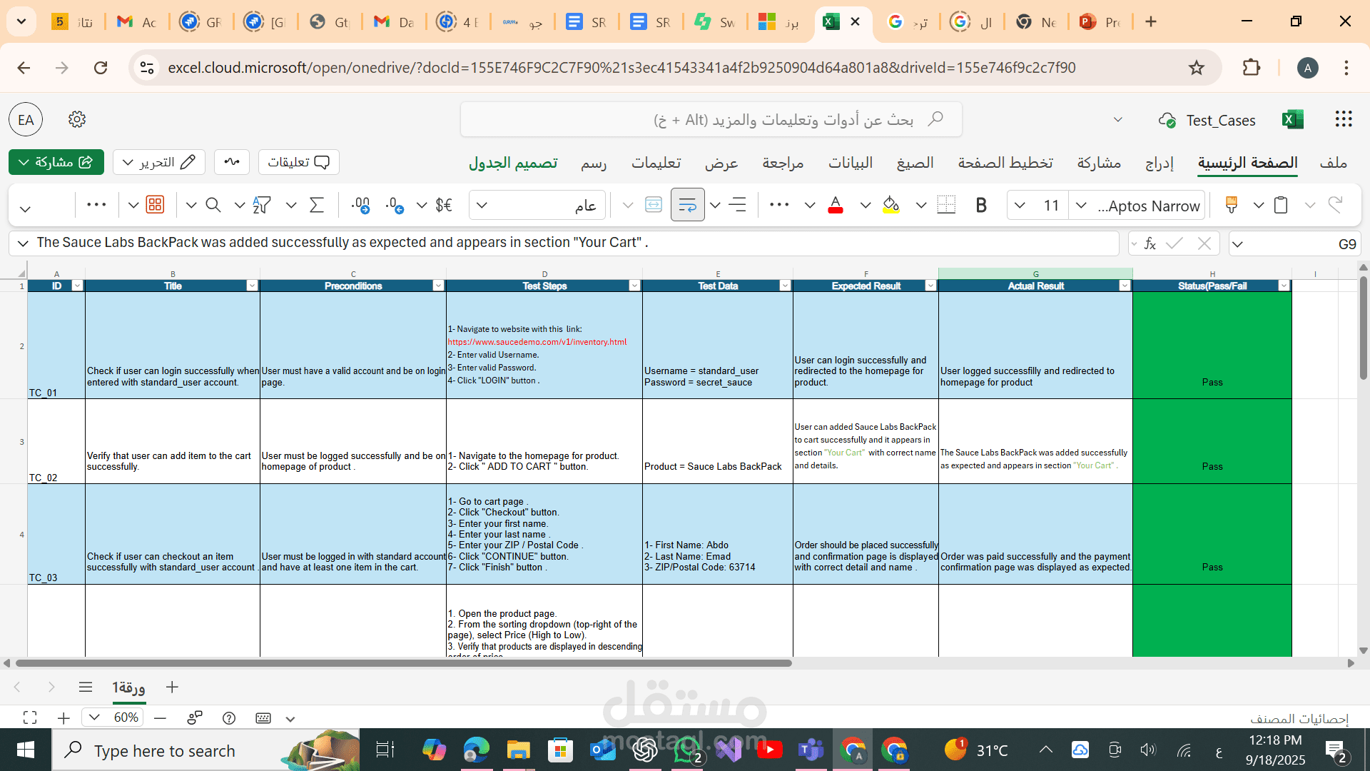 صممت ونفذت Test Cases تغطي وظائف رئيسية مثل تسجيل الدخول، إضافة المنتجات للسلة، عملية الدفع، وفرز المنتجات.