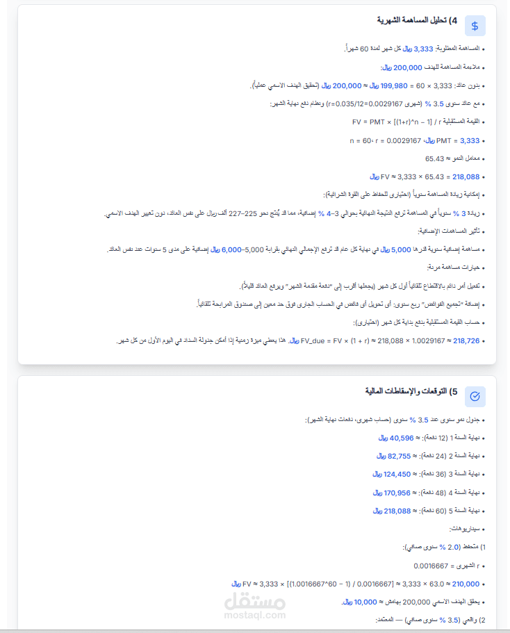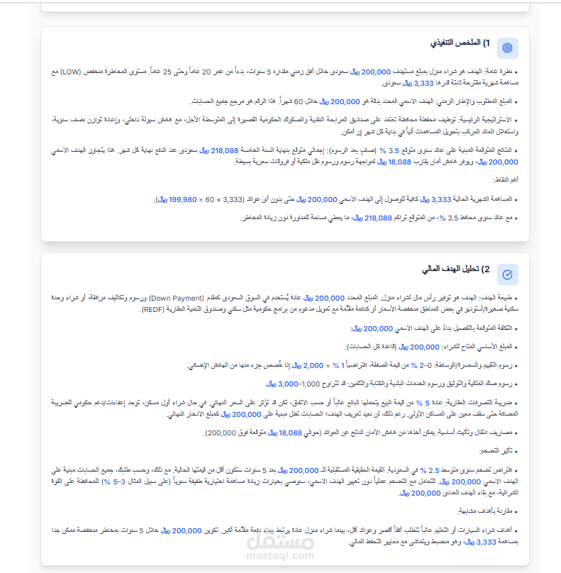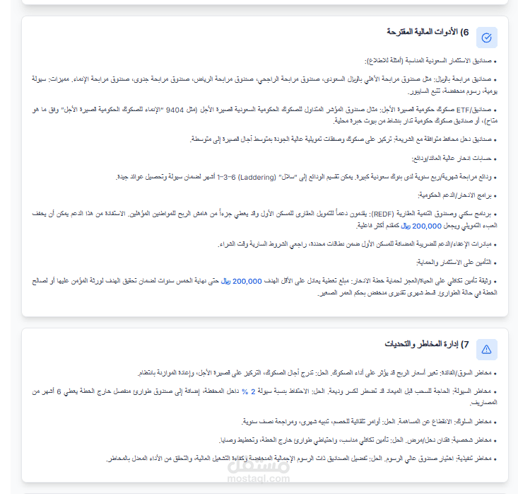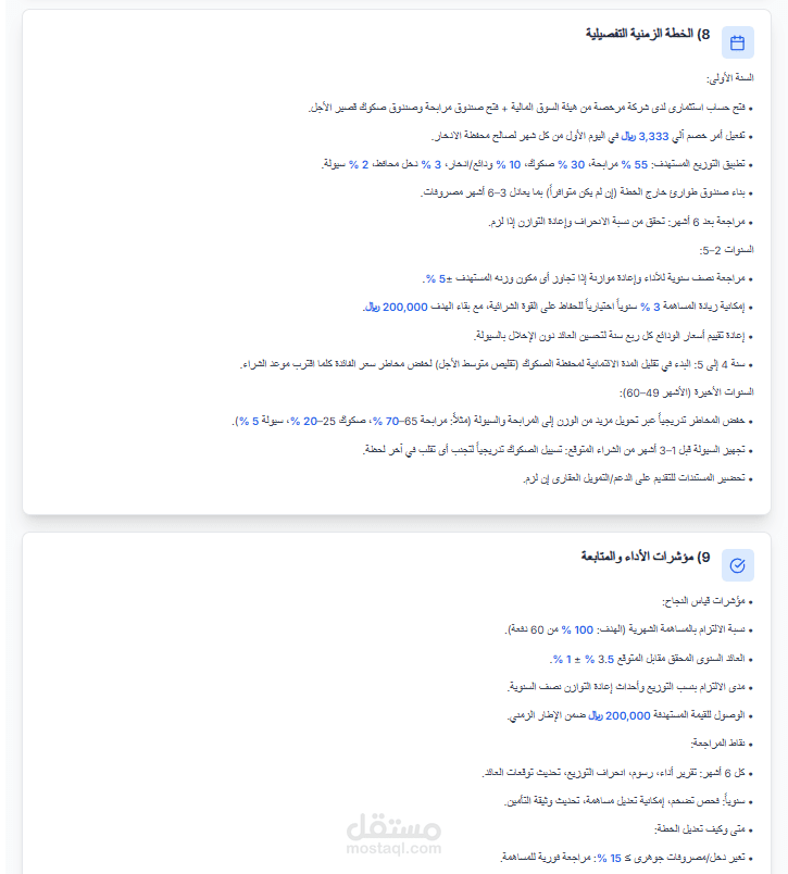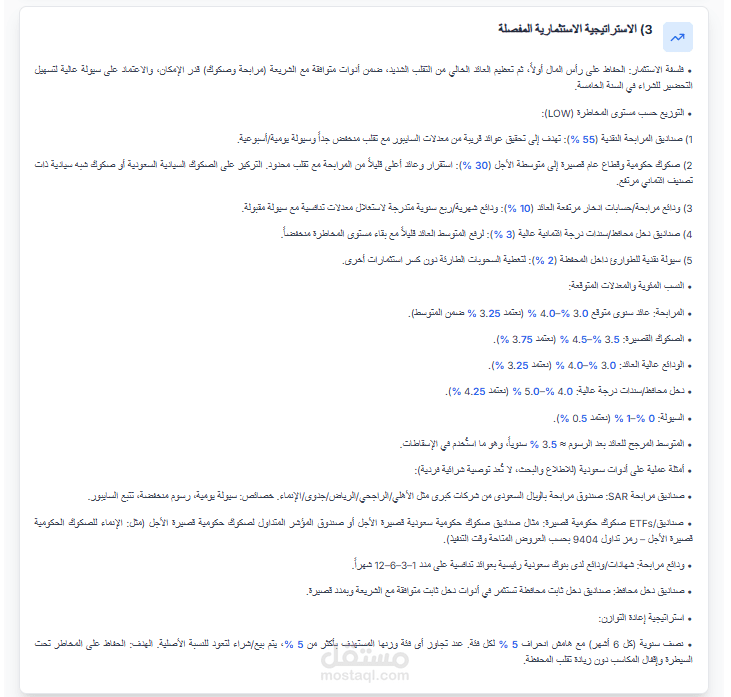 يضع الذكاء الصناعي خطة محكمة علي حسب درجة المخاطرة المطلوبة ويعطي تقريرا مفصلا من 16 صفحة مدعم باحتمالات التضخم و بعض الرسومات الموضحة وبعض التوصيات