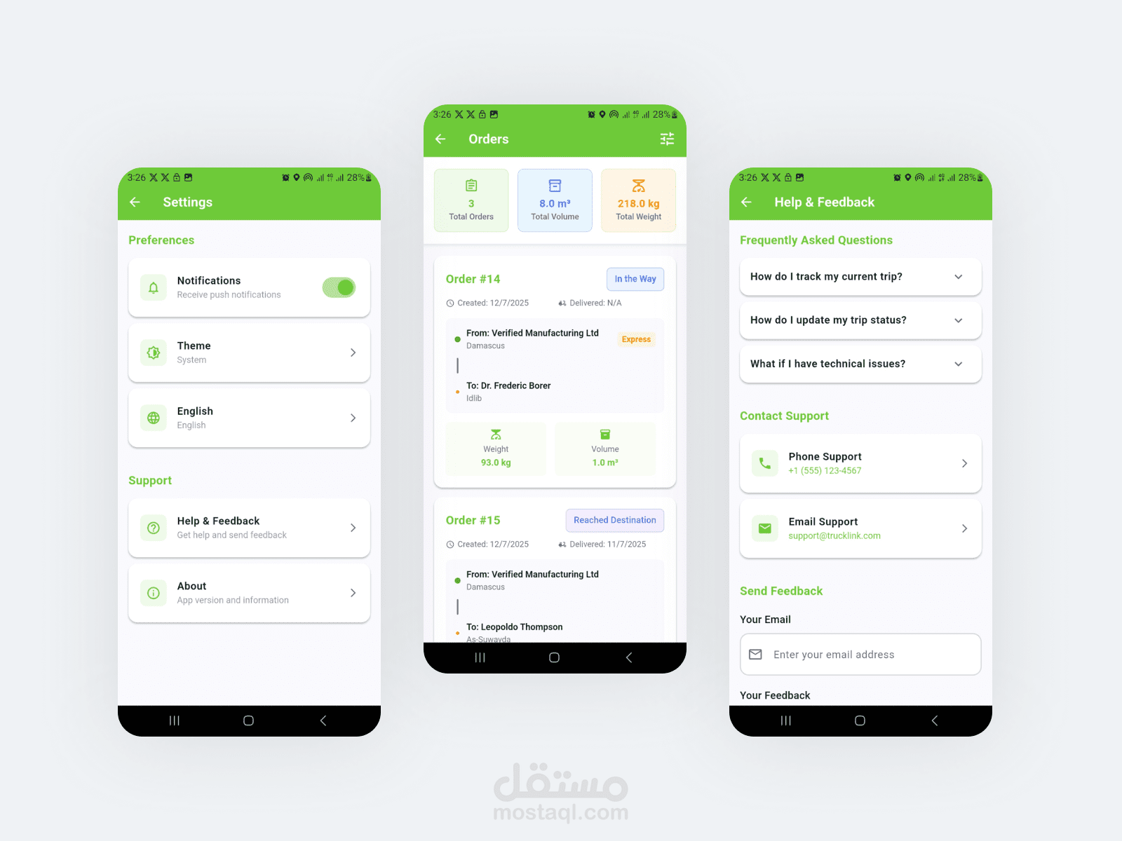 إدارة السوق والطلبات: تصفح السوق – إنشاء طلب نقل بضاعة (اسم، وصف، صورة، أماكن، بيانات المرسل والمستلم، نوع الشحن …) – تعديل/حذف الطلب – متابعة الطلبات والعروض – قبول/رفض العروض – عرض الفواتير السابقة والحالية.
