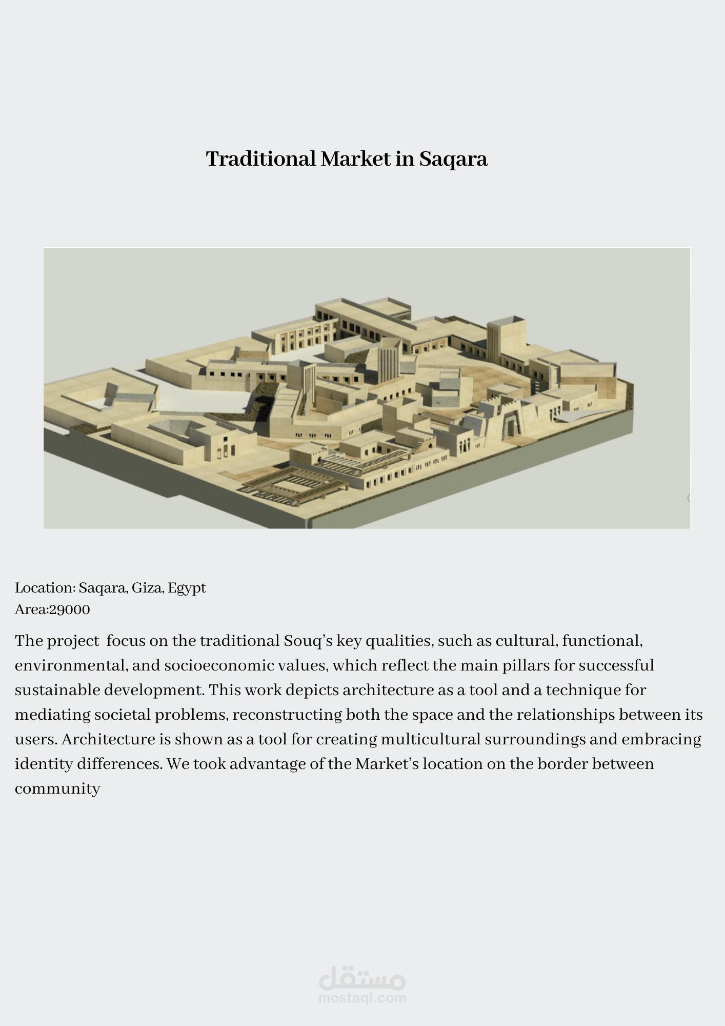 The project focus on the traditional Souq’s key qualities, such as cultural, functional, environmental, and socioeconomic values, which reflect the main pillars for successful sustainable development. This work depicts architecture as a tool and a technique for mediating societal problems, reconstructing both the space and the relationships between its users. Architecture is shown as a tool for creating multicultural surroundings and embracing identity differences. We took advantage of the Market’s location on the border between community