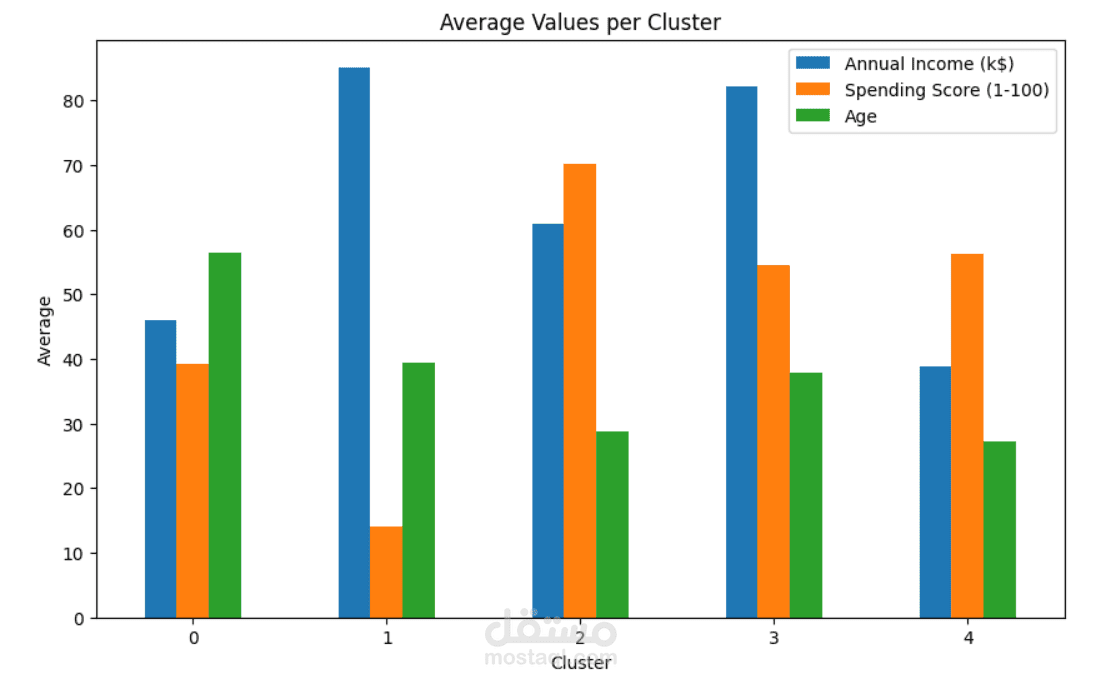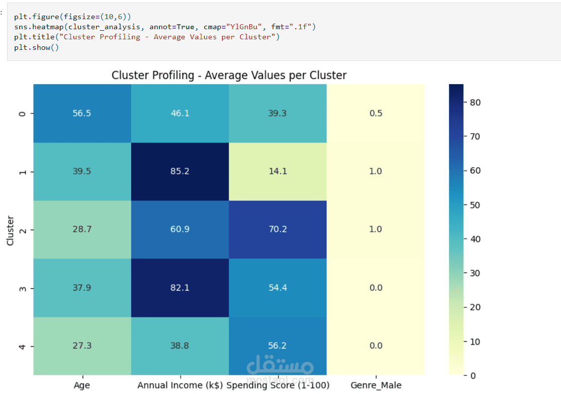 تحليل كل Cluster وتحديد خصائصه (مثل العملاء ذوي الدخل العالي لكن إنفاق منخفض، أو الشباب ذوي الإنفاق المرتفع).