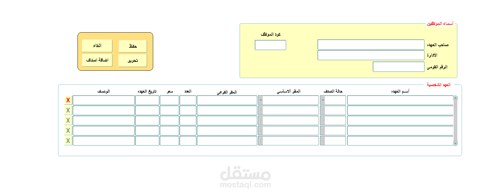 حيث يقوم المستخدم المتخصص باضافة العهد الشخصية على الموظفين ومراجعة ما تم عليه من اضافات وعهد شخصية سابقة