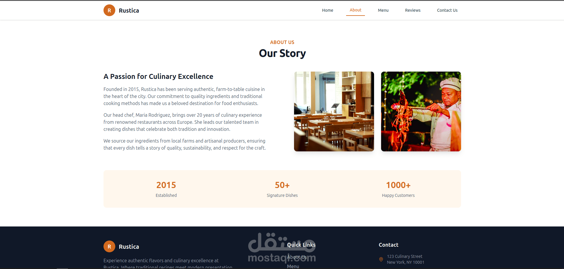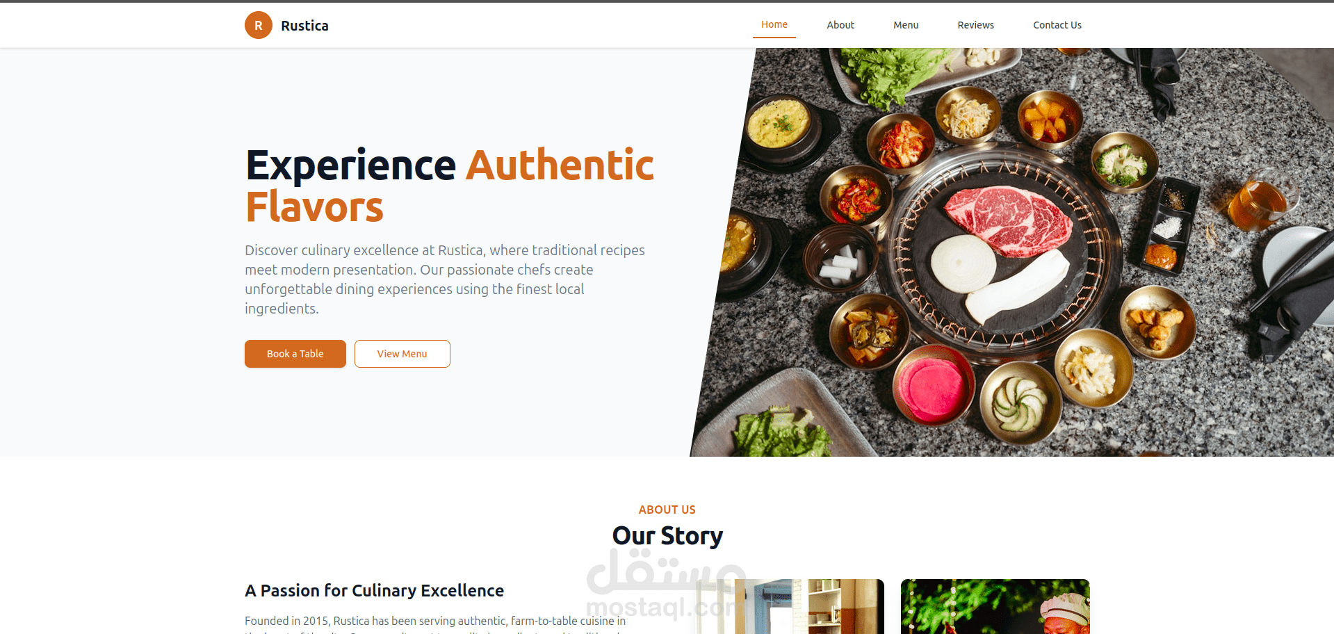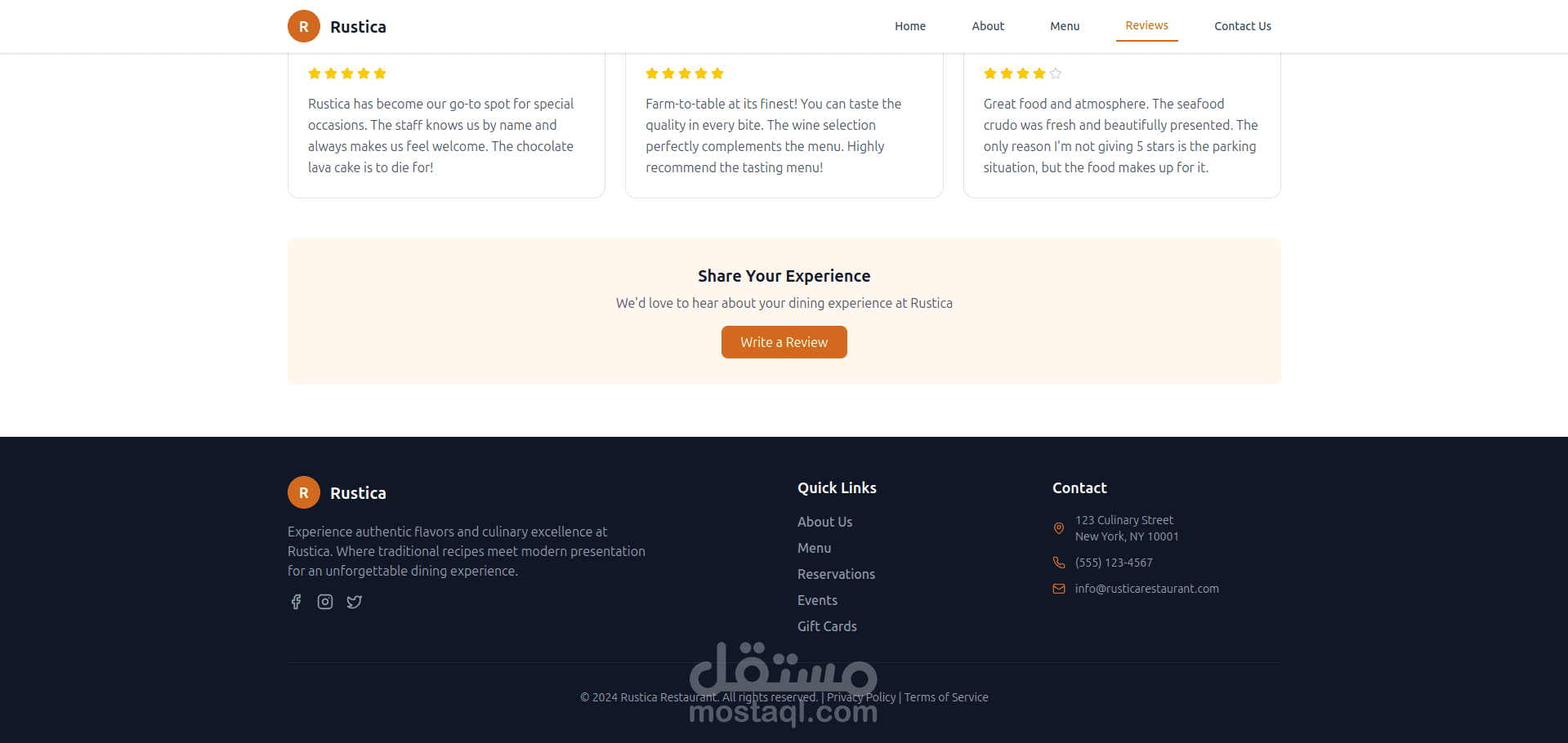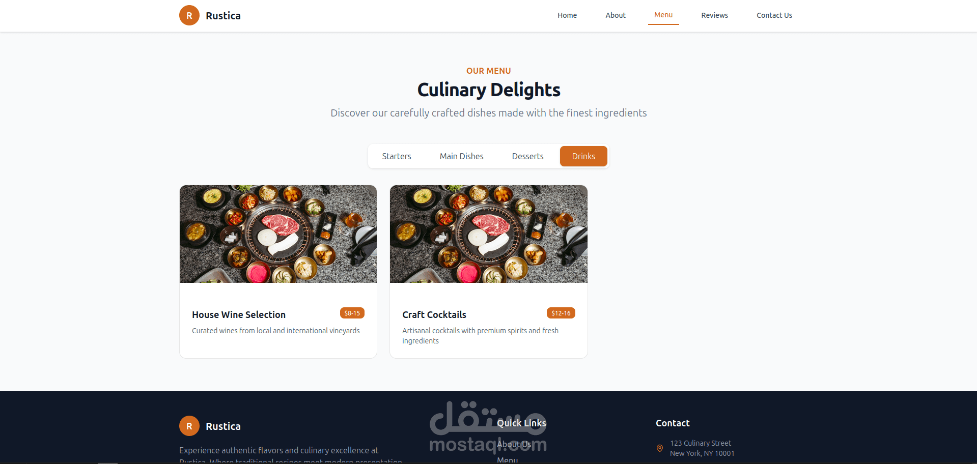 تصميم موقع مطعم حديث ومتجاوب ، يشمل هيدر نظيف، قائمة تنقل، صفحة المنيو، تقييمات العملاء، وصفحة اتصل بنا.