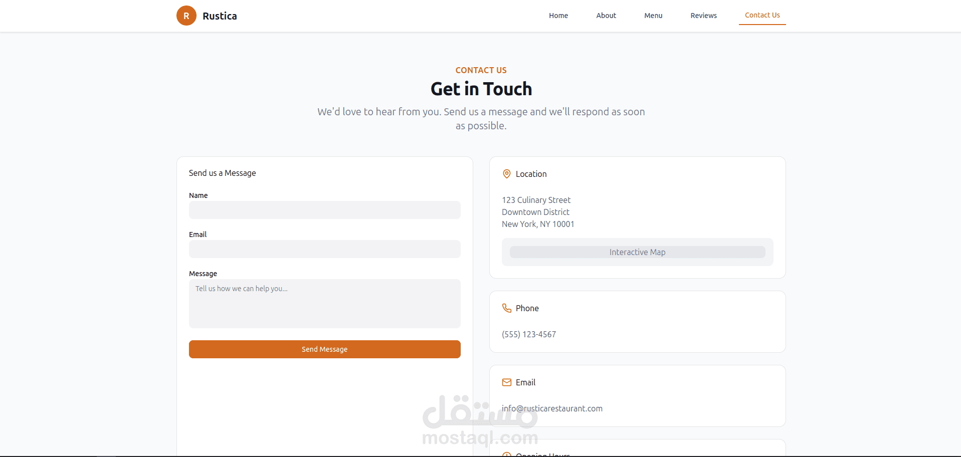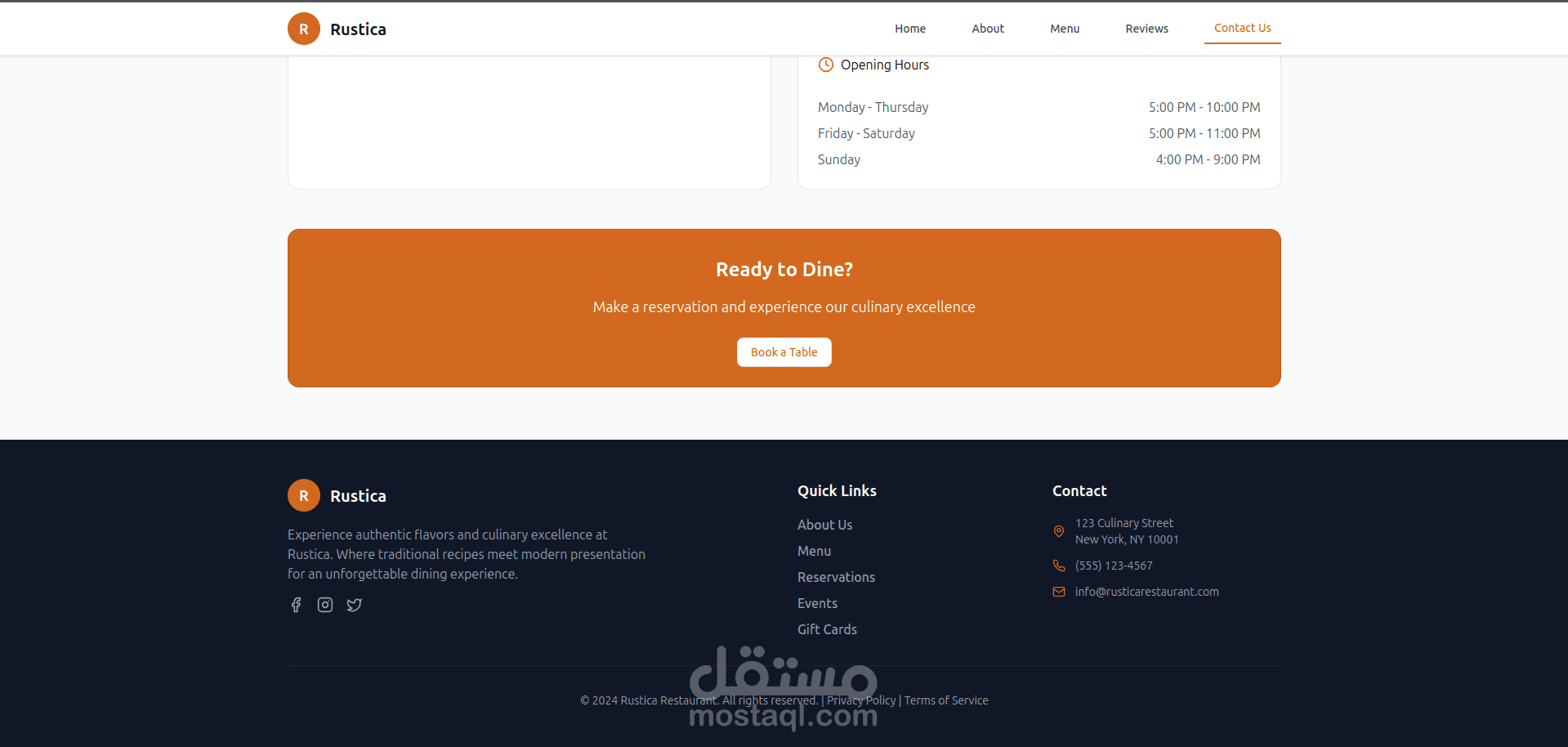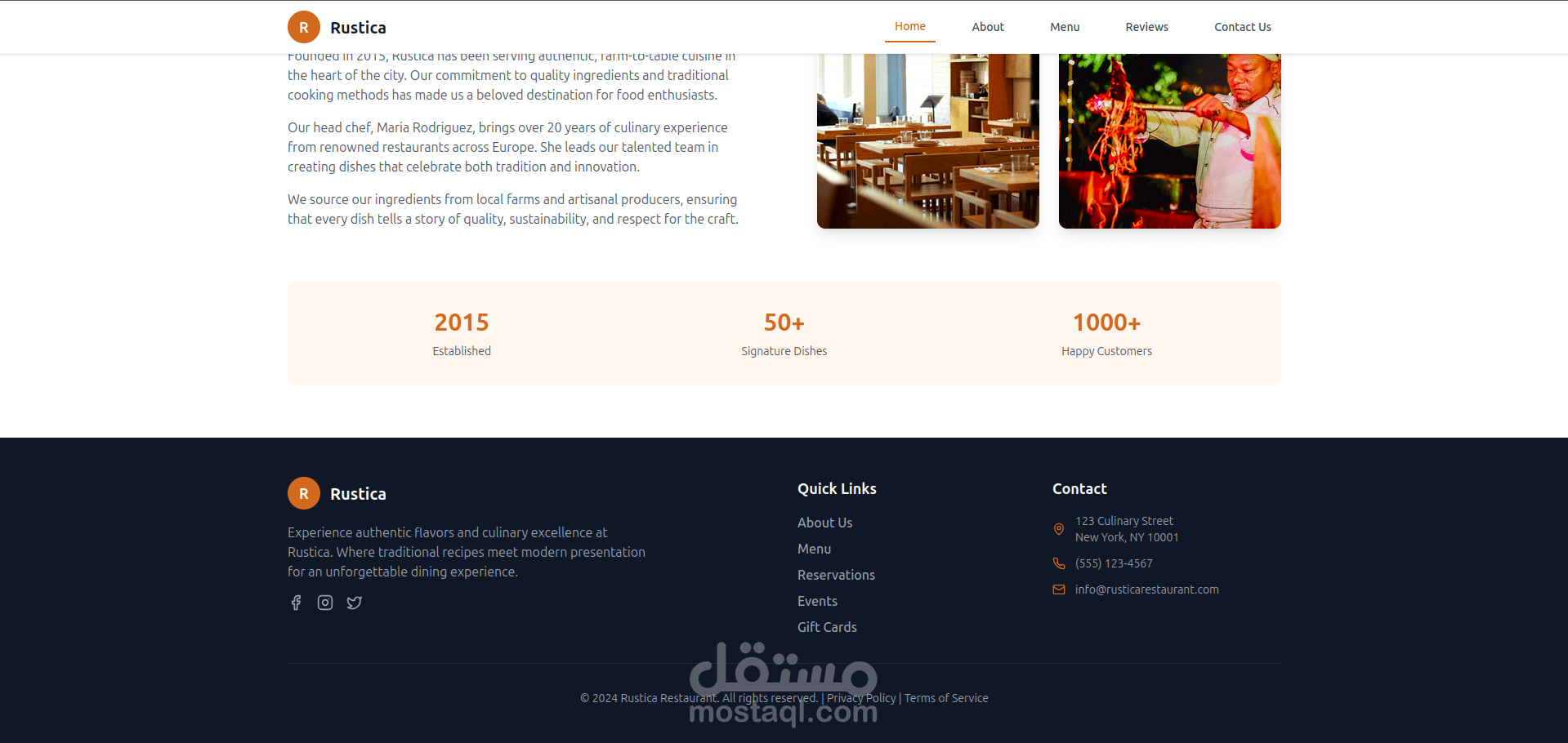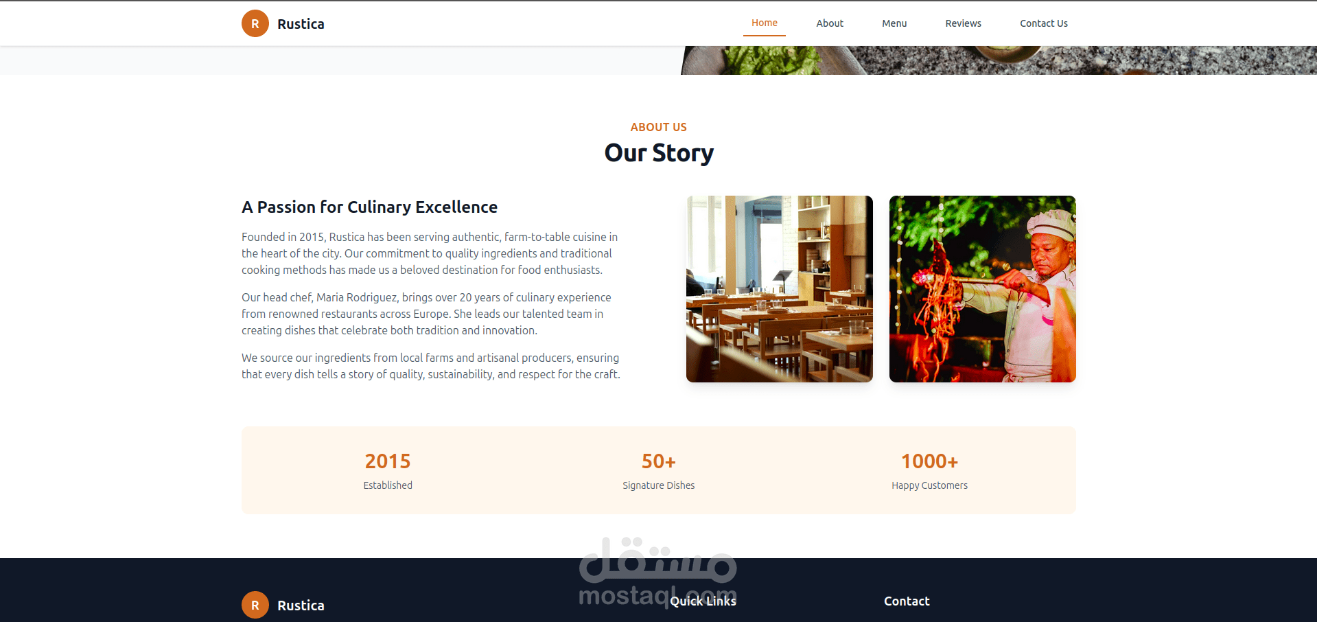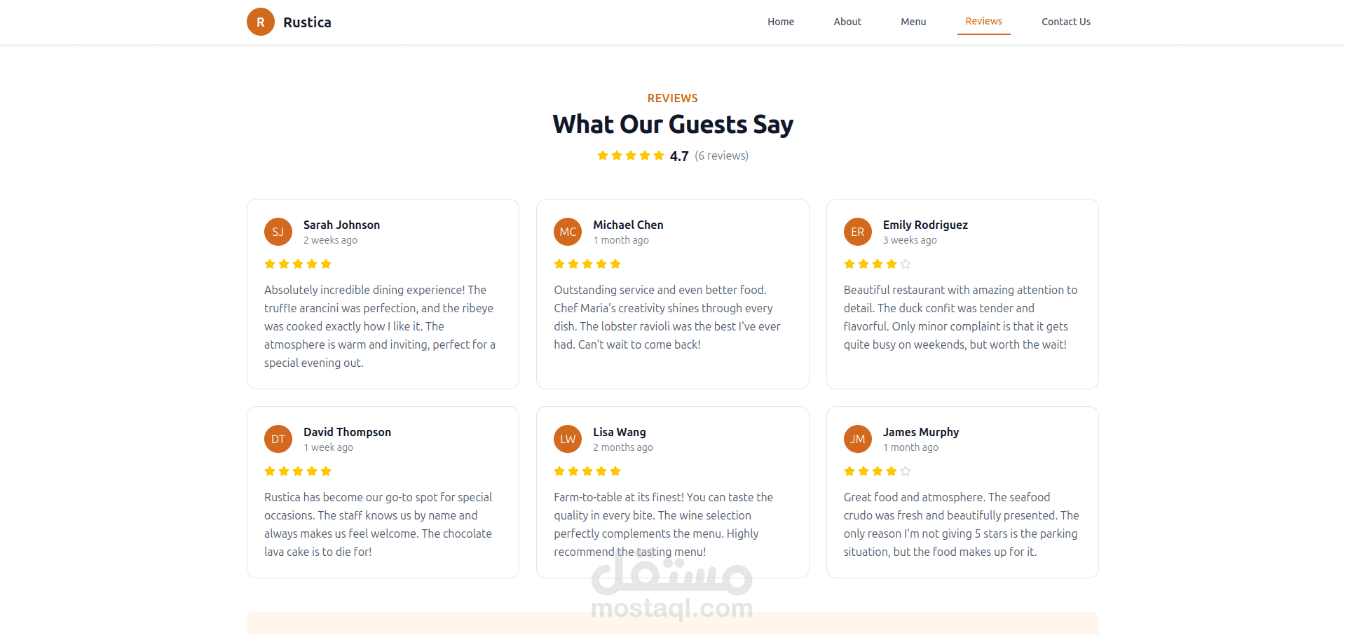 تصميم موقع مطعم حديث ومتجاوب ، يشمل هيدر نظيف، قائمة تنقل، صفحة المنيو، تقييمات العملاء، وصفحة اتصل بنا.