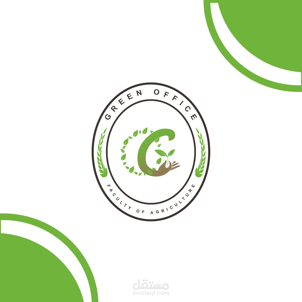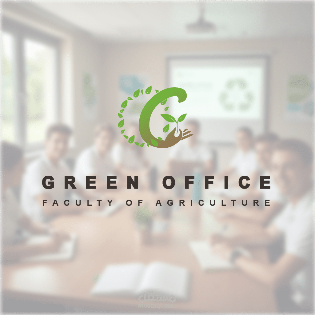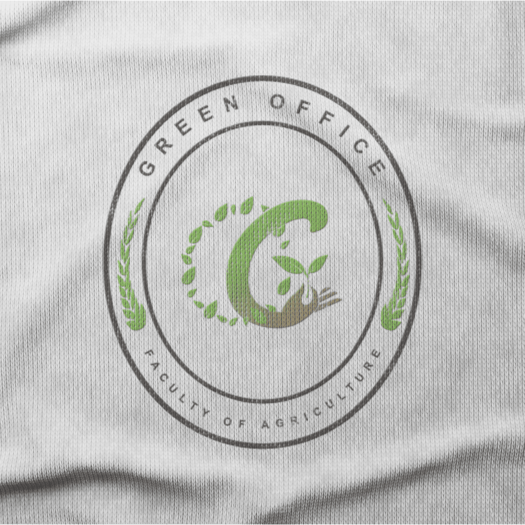 عناصر إضافية: يحيط بالرمز المركزي إطار دائري يضم اسم المبادرة "GREEN OFFICE" واسم الجهة التابعة لها "FACULTY OF AGRICULTURE"، مما يؤكد الانتماء الرسمي للمشروع. كما تظهر في بعض الأشكال الأخرى أوراق نباتية تحيط بالشعار، مما يعزز المفهوم البيئي.