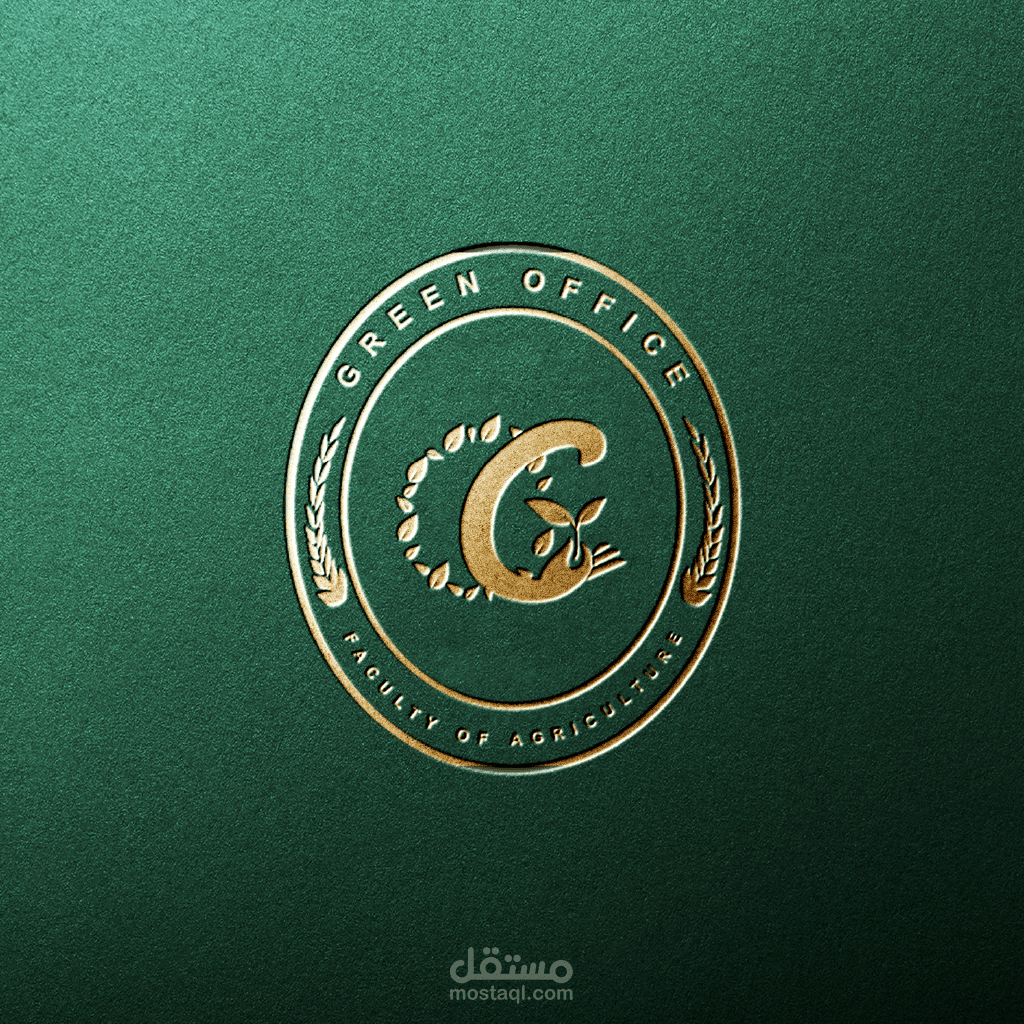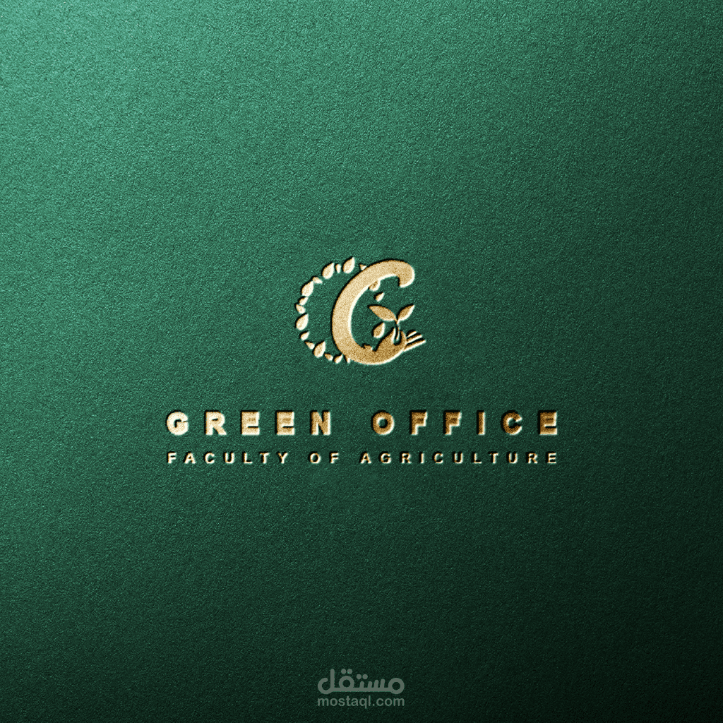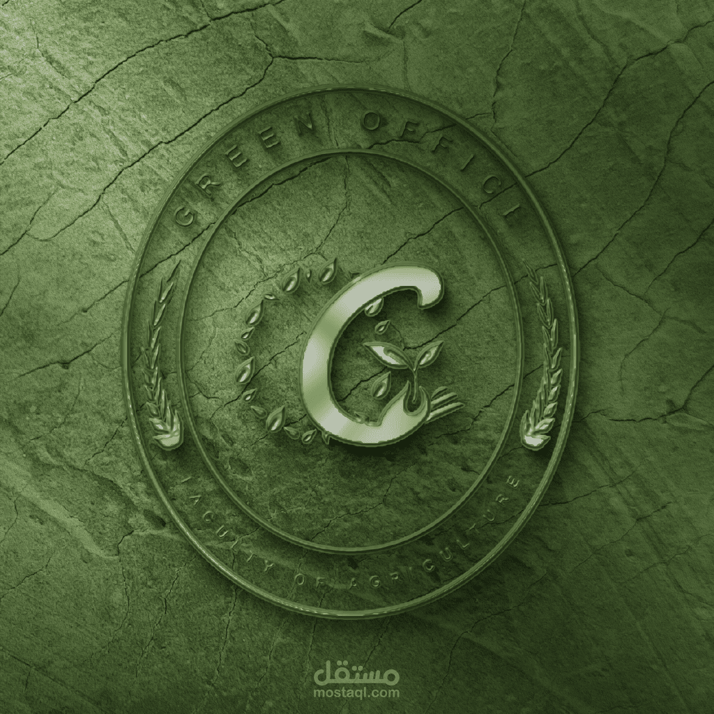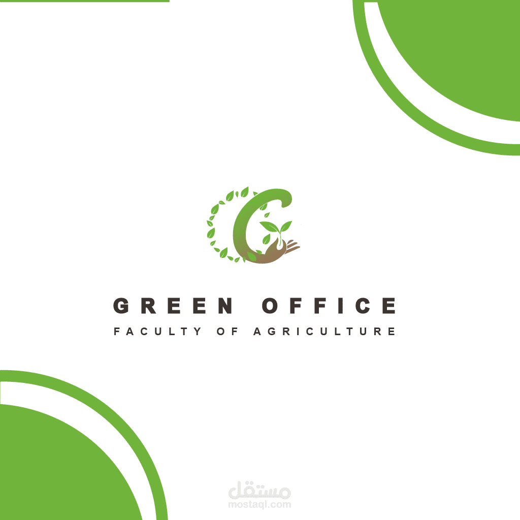 عناصر إضافية: يحيط بالرمز المركزي إطار دائري يضم اسم المبادرة "GREEN OFFICE" واسم الجهة التابعة لها "FACULTY OF AGRICULTURE"، مما يؤكد الانتماء الرسمي للمشروع. كما تظهر في بعض الأشكال الأخرى أوراق نباتية تحيط بالشعار، مما يعزز المفهوم البيئي.