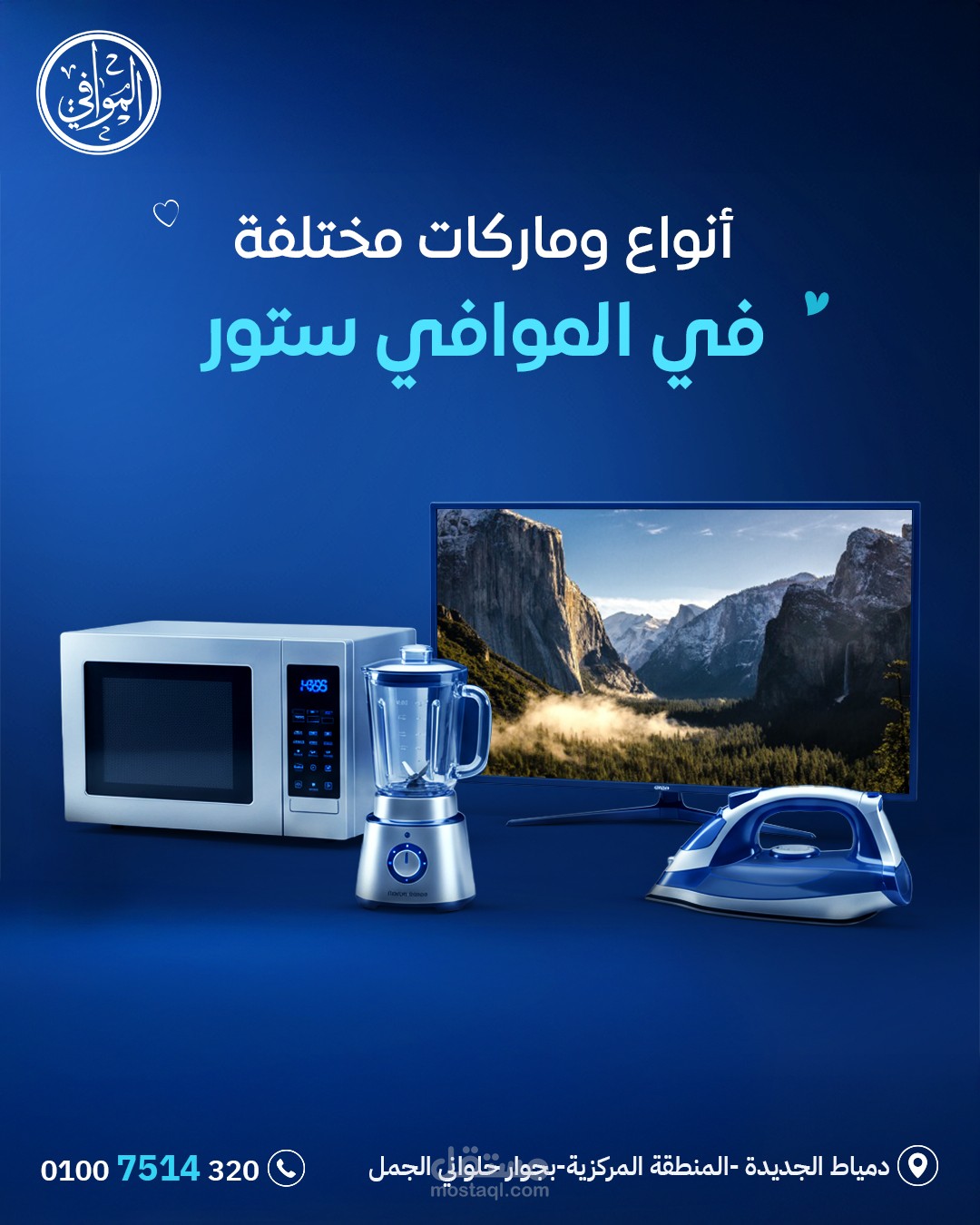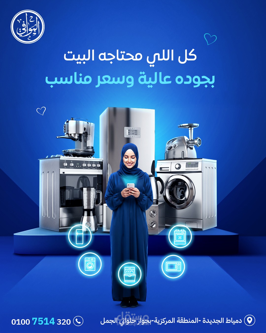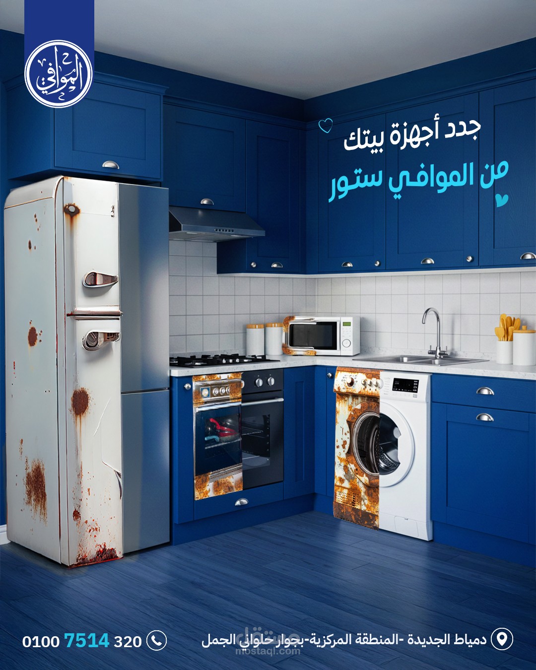 مشروع تصميمات سوشيال ميديا لمتجر الموافي ستور المتخصص في بيع الأدوات المنزلية والأجهزة الكهربائية مثل الحلل، أدوات المطبخ، الغسالات، البوتاجازات، وكل ما يخص البيت.
