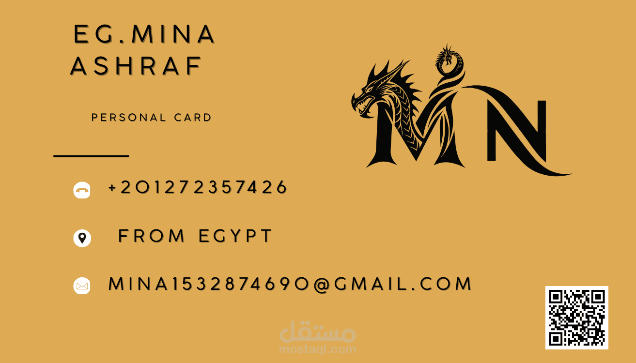 بطاقة شخصية أنيقة بتصميم عصري مميز، ألوانها الدافئة مع الخط البسيط بتدي إحساس بالاحترافية والرقي. الشعار في المنتصف عبارة عن دمج مبتكر لحرف M مع رسمة تنين قوية، بيعبر عن القوة، الإبداع، والتفرد. البيانات متوزعة بشكل مرتب وواضح مع إضافة كود QR لسهولة التواصل.
