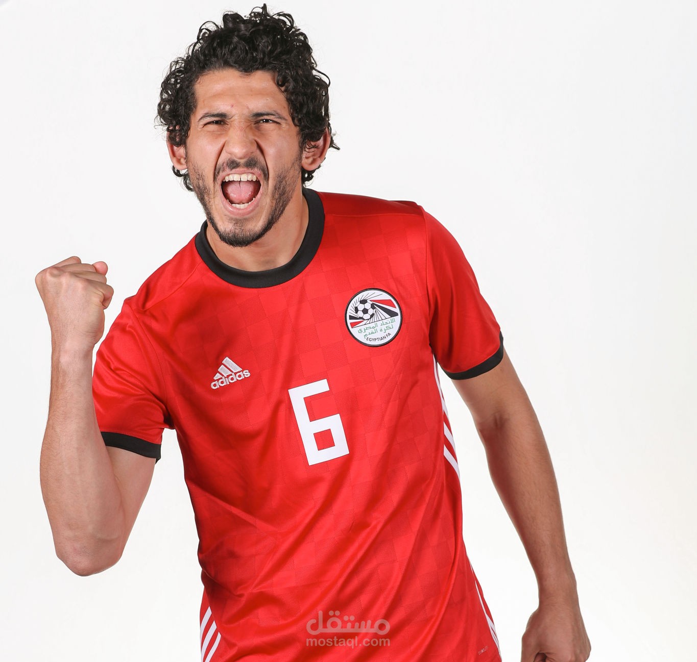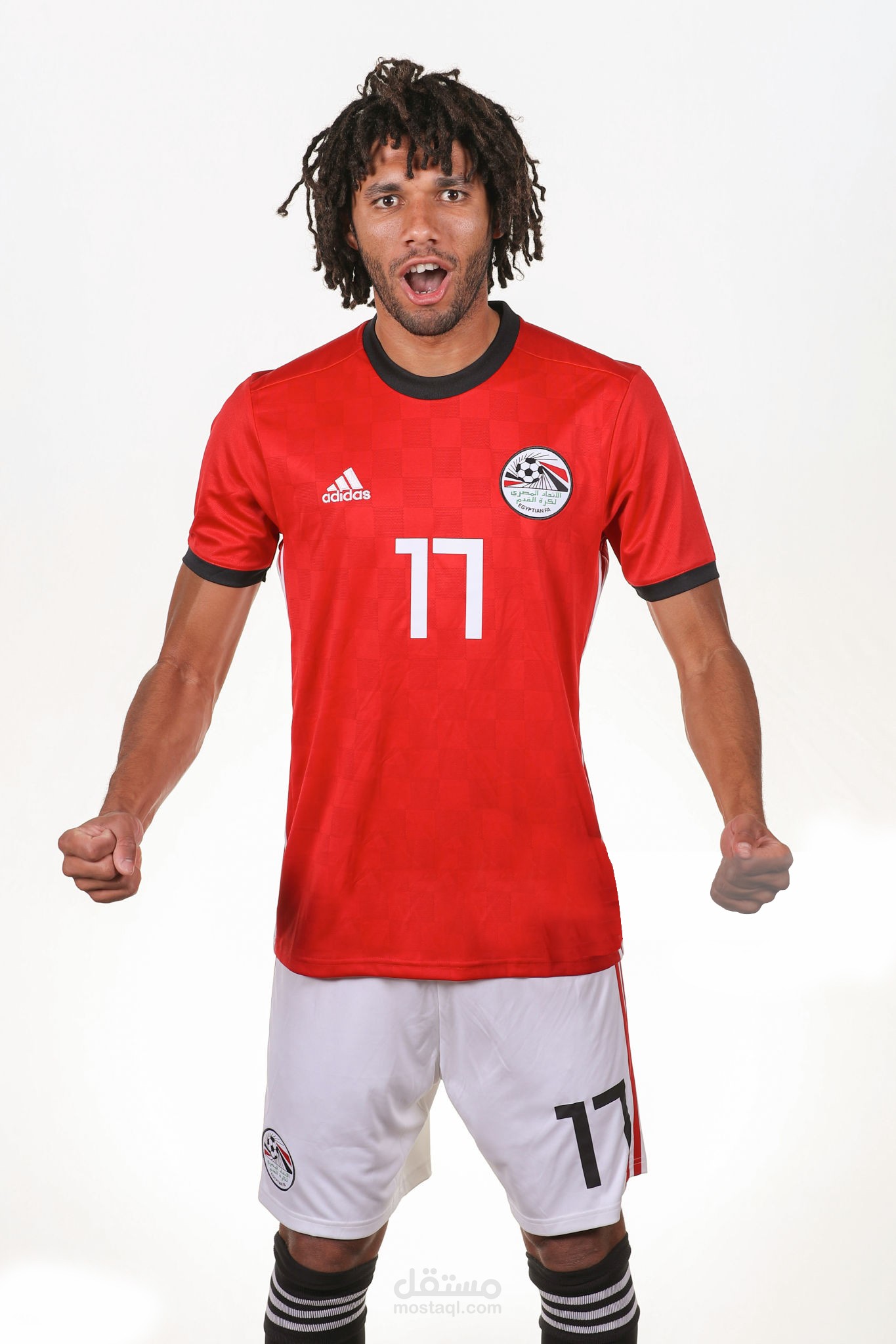 تصميم إعلاني احترافي لمنتخب مصر لكرة القدم، بستايل ملحمي يمزج بين قوة الحاضر وعراقة الماضي.