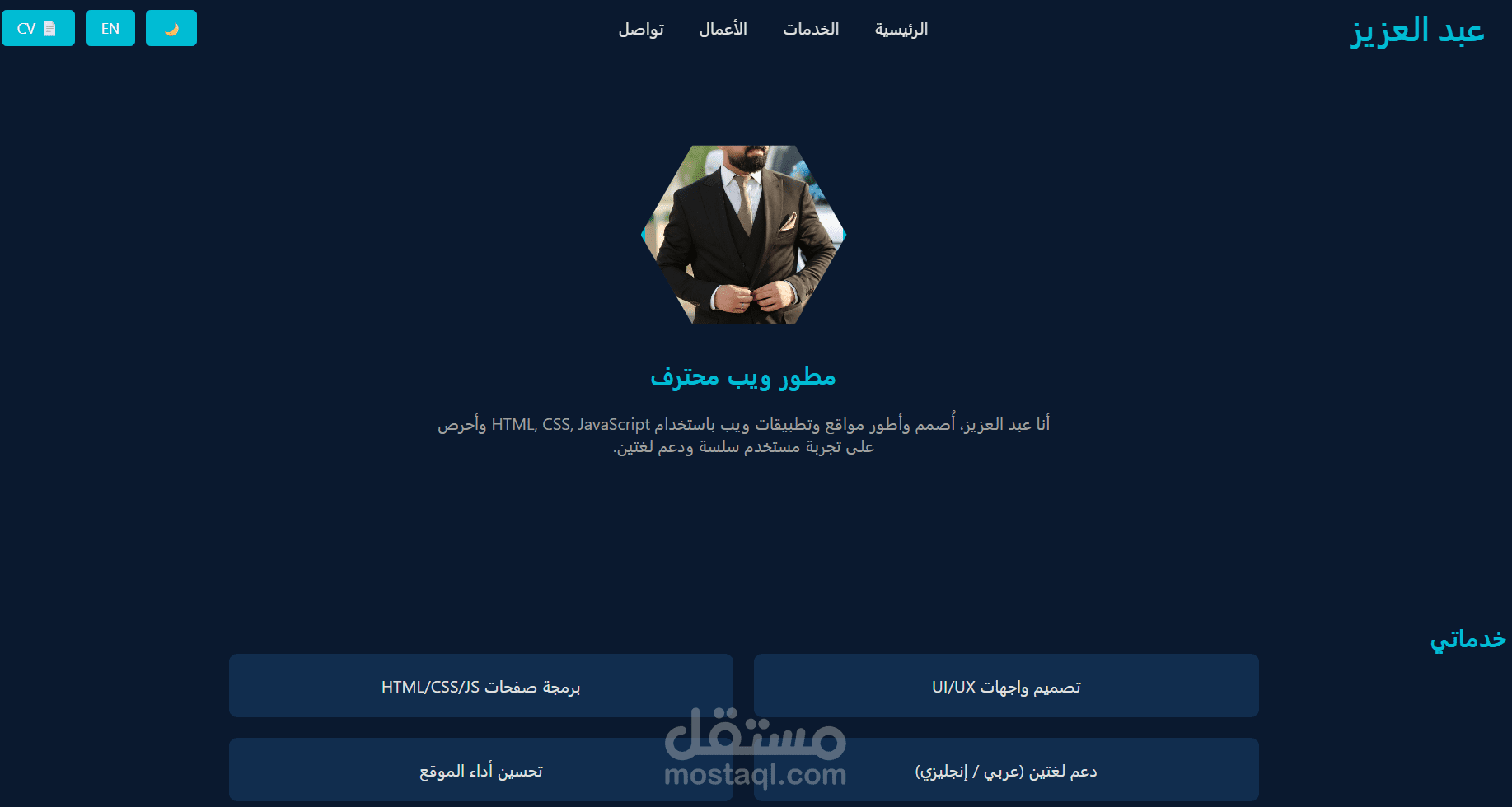 الموقع عبارة عن بورتفوليو (Portfolio) شخصي يعرّف بك كمطوّر ويب محترف، ويعرض مهاراتك وخدماتك بشكل أنيق ومباشر. الهدف الأساسي منه هو تقديم نفسك للعملاء أو أصحاب العمل بطريقة تبرز خبراتك التقنية وتسهّل التواصل معك.