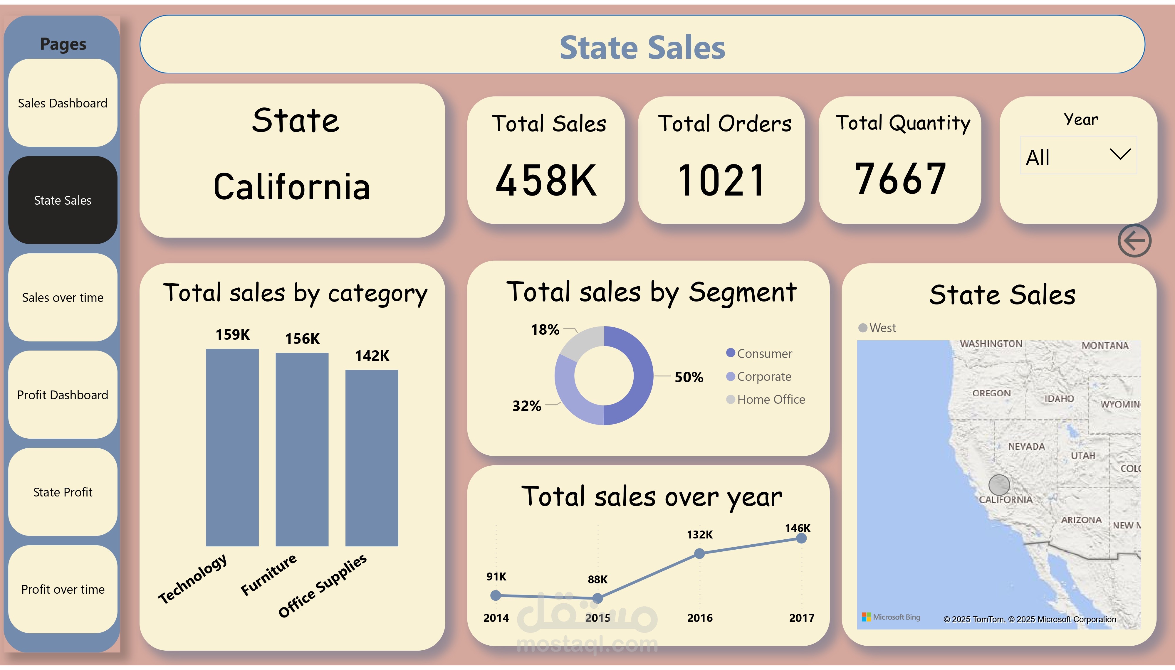 قمت ببناء لوحة معلومات (Dashboard) شاملة لبيانات المبيعات والأرباح لشركات في الولايات المتحدة باستخدام Power BI، وشملت: