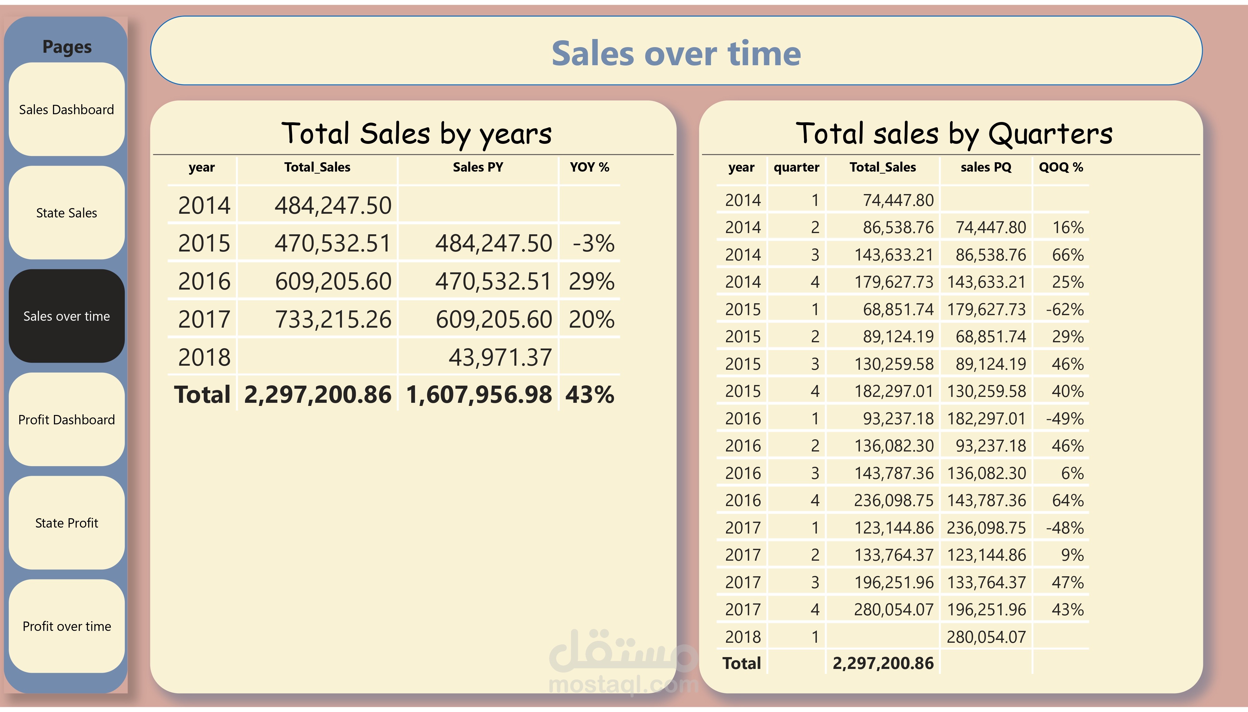 بناء Measures باستخدام DAX لحساب مؤشرات الأداء مثل: YOY%، QOQ%، ومقارنات المبيعات والأرباح بالفترات السابقة.
