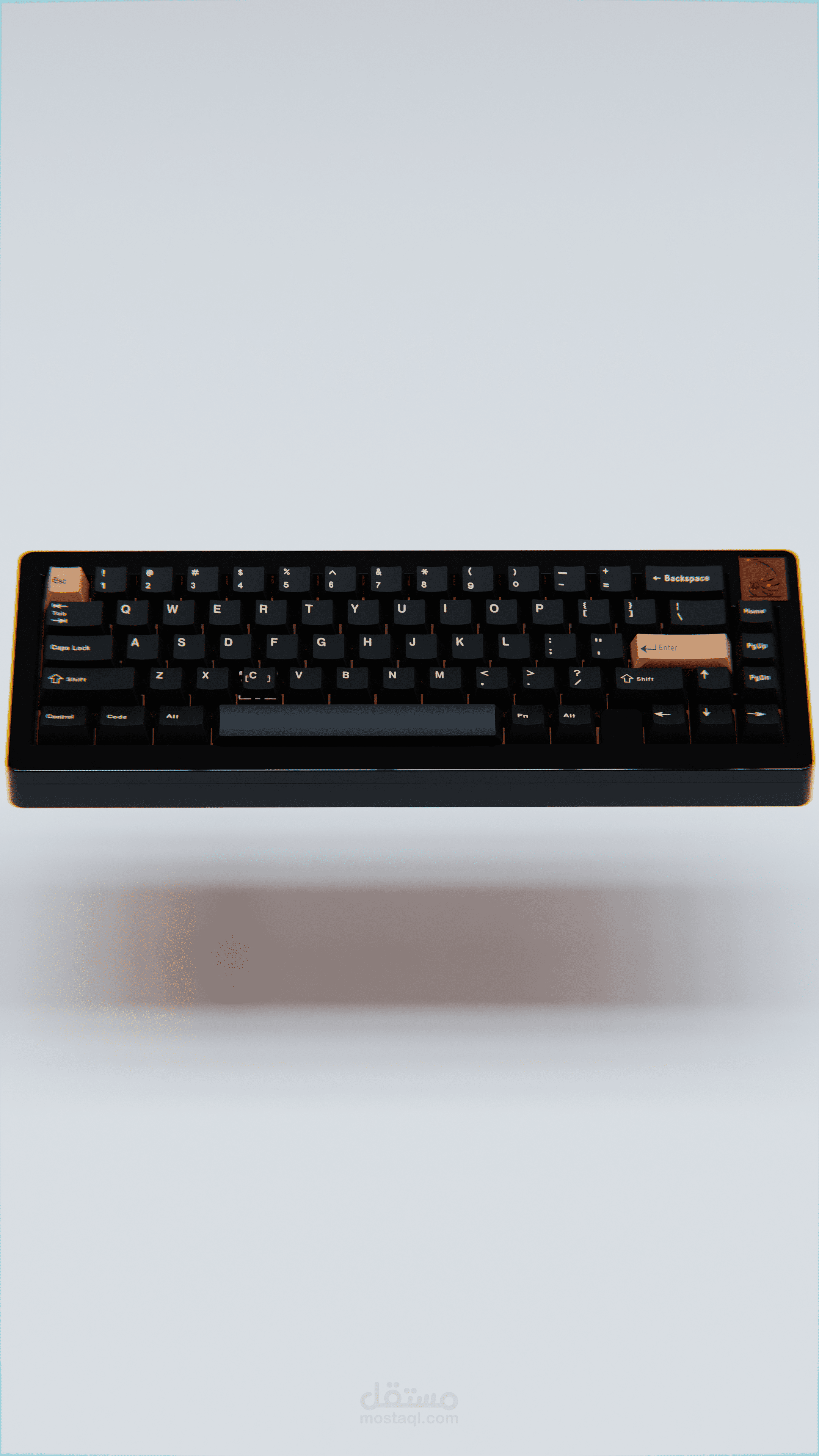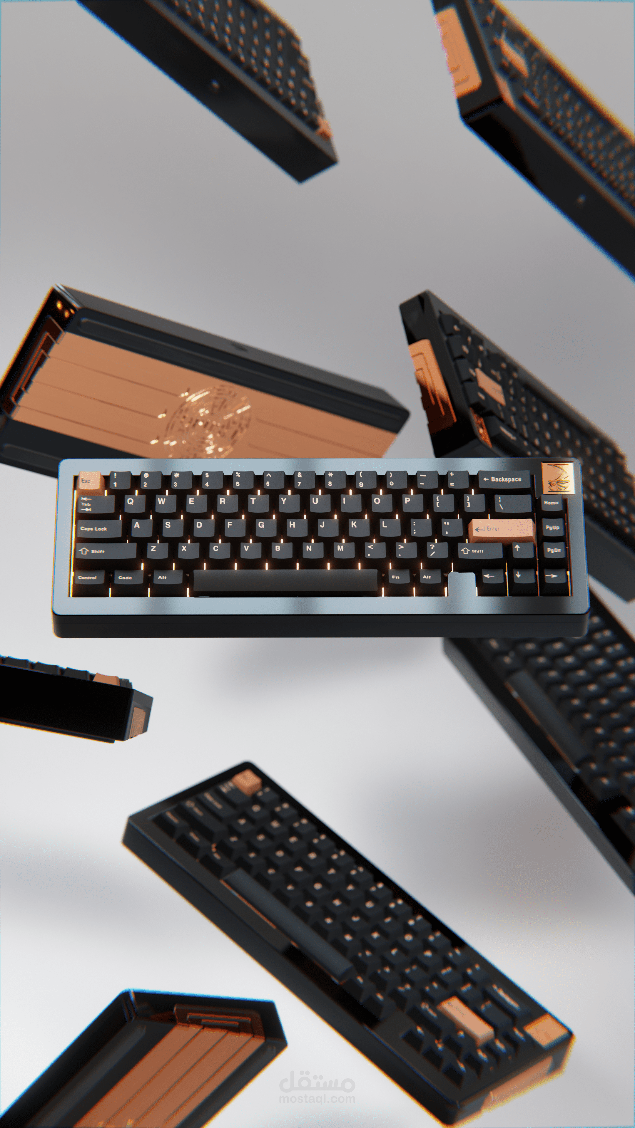 مشروع تصميم ثلاثي الأبعاد يستعرض لوحة مفاتيح ميكانيكية بشكل مبتكر، حيث تظهر المفاتيح والكيبوردات وكأنها عائمة في الهواء. التركيز في العمل كان على إبراز التفاصيل الدقيقة والخامات المعدنية اللامعة، مع إضاءة واقعية تمنح المشهد طابعًا إعلانياً فاخراً يليق بالمنتج.
