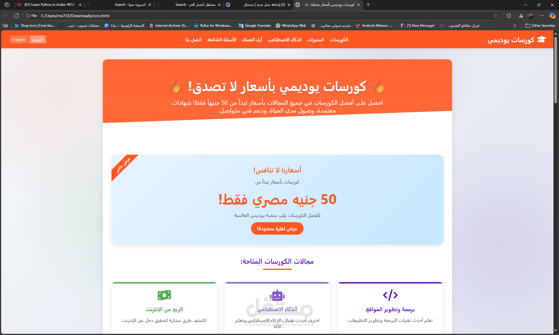 هذا الموقع هو صفحة هبوط (Landing Page) لعمل تجاري عبر الإنترنت متخصص في بيع كورسات منصة Udemy بأسعار مخفضة جداً، حيث تبدأ الأسعار من 50 جنيهاً مصرياً فقط. تم تصميم الموقع لجذب عملاء جدد وتقديم معلومات أساسية حول الكورسات المتاحة، والمميزات، وطريقة الشراء. الموقع ثنائي اللغة (العربية والإنجليزية) مع التركيز على اللغة العربية كلغة أساسية.