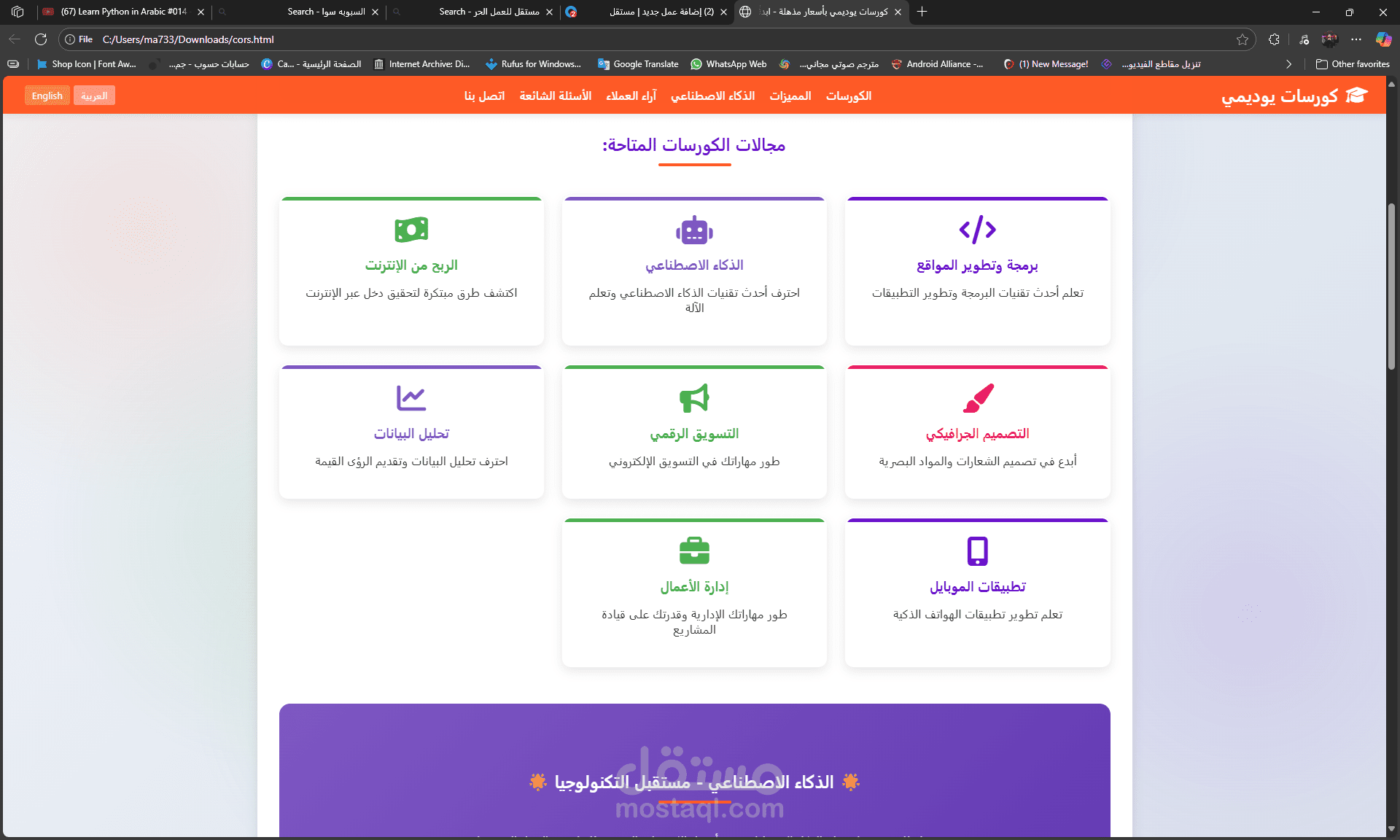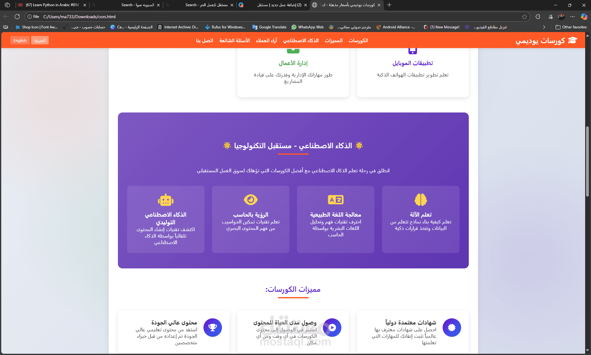 قسم الذكاء الاصطناعي: قسم مخصص وبارز لترويج كورسات الذكاء الاصطناعي، ويسلط الضوء على المجالات الرئيسية مثل تعلم الآلة، ومعالجة اللغة الطبيعية، والذكاء الاصطناعي التوليدي.