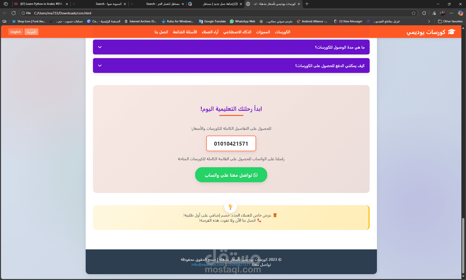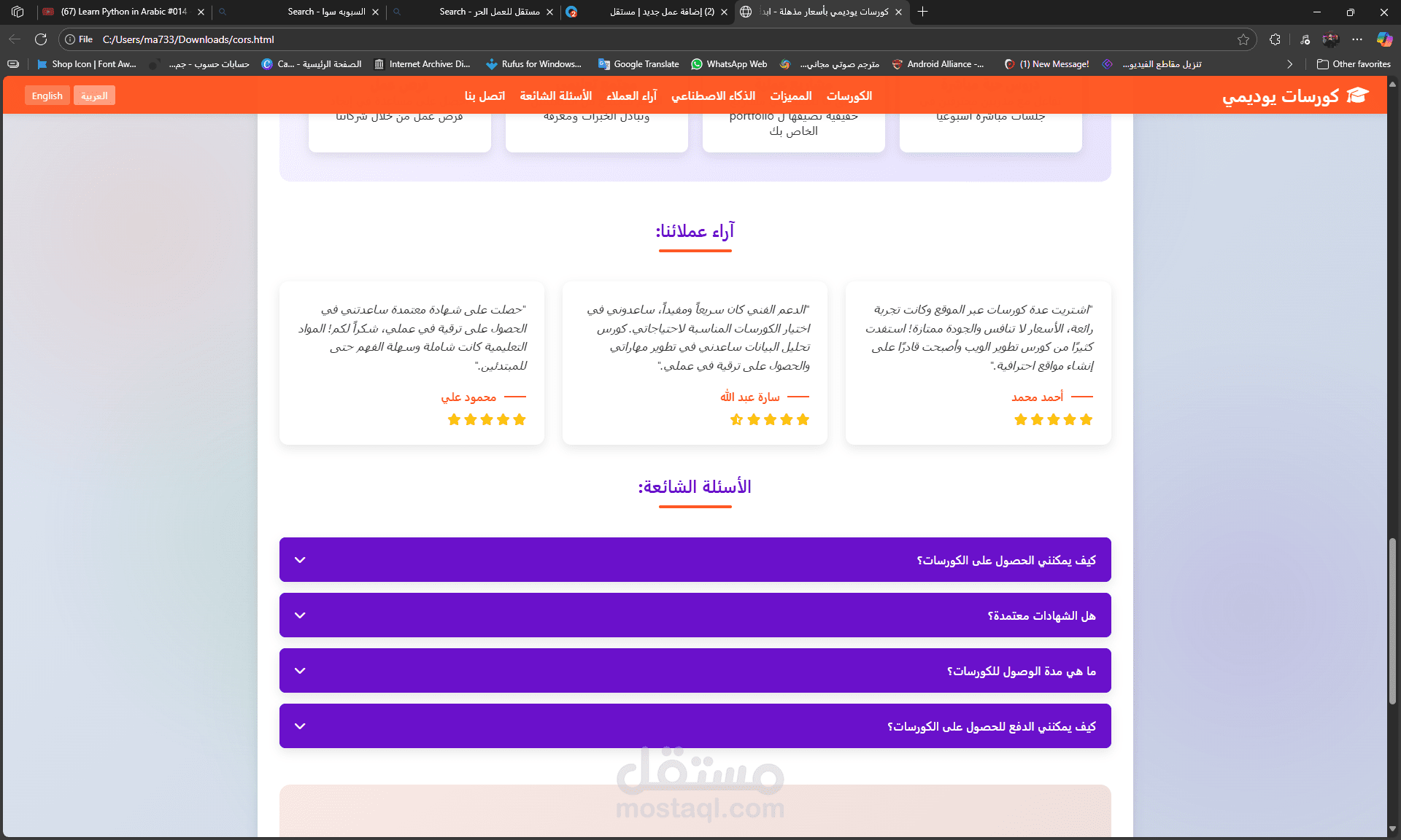الأسئلة الشائعة (FAQ): يقدم إجابات للأسئلة المتكررة حول عملية الشراء، وصحة الشهادات، ومدة الوصول إلى الكورسات، وطرق الدفع.